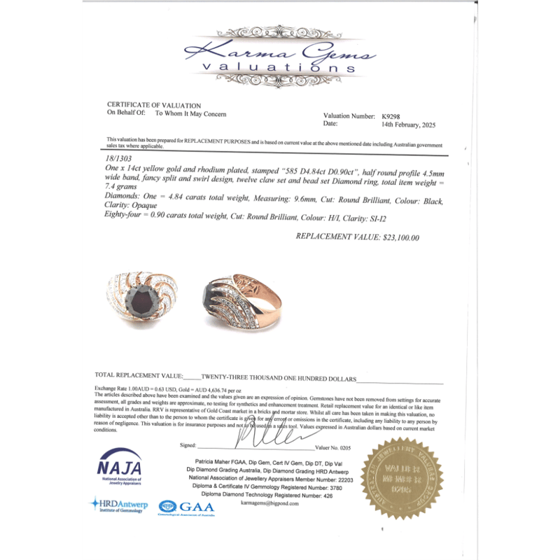 The Centre Features, One Round Brilliant Cut, Black, Diamond (4.84Ct, Opaque), Multi-Claw Set. Encompassing The Centre Are, 84 Round Brilliant Cut, Diamonds (0.90Ct Tdw, H-I Colour, Si-I2 Clarity), Micro-Bead Set. Ring Size O.