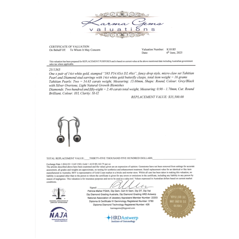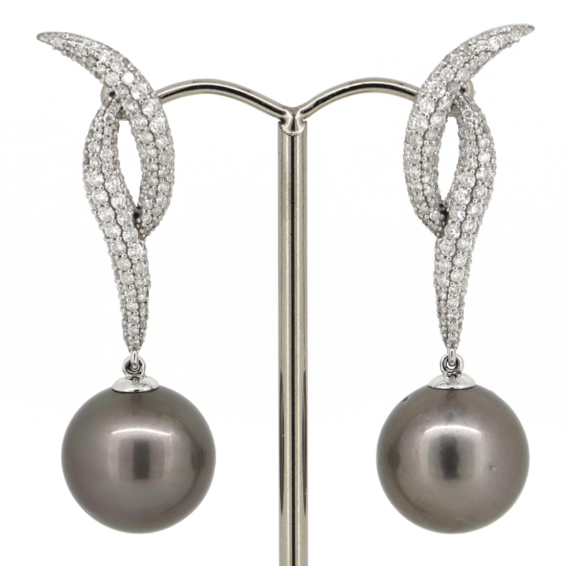 The Earrings Feature, 2 Round, Grey/Black With Silver Overtones, Cultured Tahitian Pearls (15.60Mm Size, Lightly Blemished). Decorating The Drops Are, 258 Round Brilliant Cut, Diamonds (2.40Ct Tdw, H-I Colour, Si-I2 Clarity), Micro-Claw Set. The Earrings Comes With Posts And 14K White Gold Butterfly Clasps.