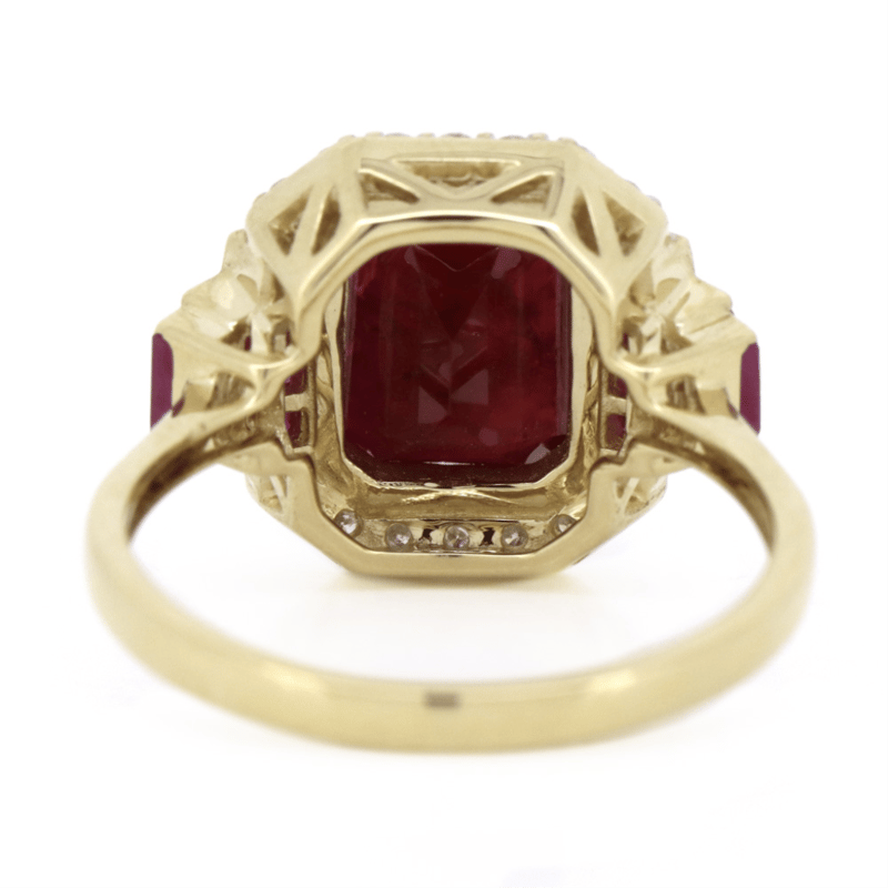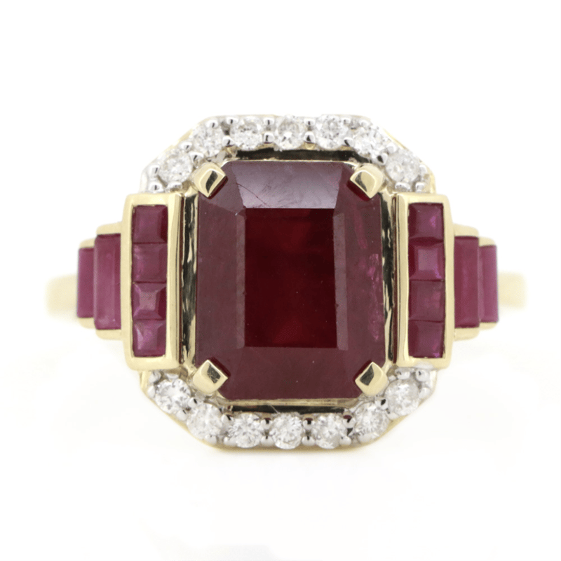 14K YELLOW GOLD, RUBY AND DIAMOND, ART DECO INSPIRED RING. The Centre Features, One Emerald Cut, Dark Red, Ruby (3.47Ct, Moderate-Heavy Inclusions), 4 Claw Set. Surrounding The Centre In A Partial Halo And Decorating The Shoulders Are, 14 Round Brilliant Cut, Diamonds (0.18Ct Tdw, G-J Colour, Si-2 Clarity), Bead/Channel Set In Yellow Gold. Accompanied By, 8 Square Cut, Dark Pinkish-Red, Rubies (0.24Ct Tsw, Light Natural Inclusions), And 4 Baguette Cut, Dark Pinkish-Red, Rubies (0.29Ct Tsw, Light Natural Inclusions), Channel Set. Ring Size O. Valuations Provided by an Independent Third-Party Professional Not Directly Associated With Lloyds Auctions at AUD $$38,300.00This valuation has been conducted by an independent third-party professional. The valuation amount is an assessment by the issuing valuer and does not reflect the auction value of the item. Any inquiries regarding the valuation should be directed to the issuing valuer (refer to contact details on the certificate), as Lloyds Auctions has no affiliation or influence over the valuation, the valuer, or the stated amount. Condition: Good - Refer Images 0645887+5035