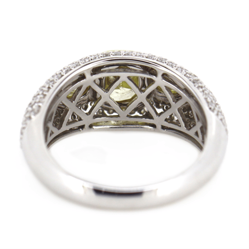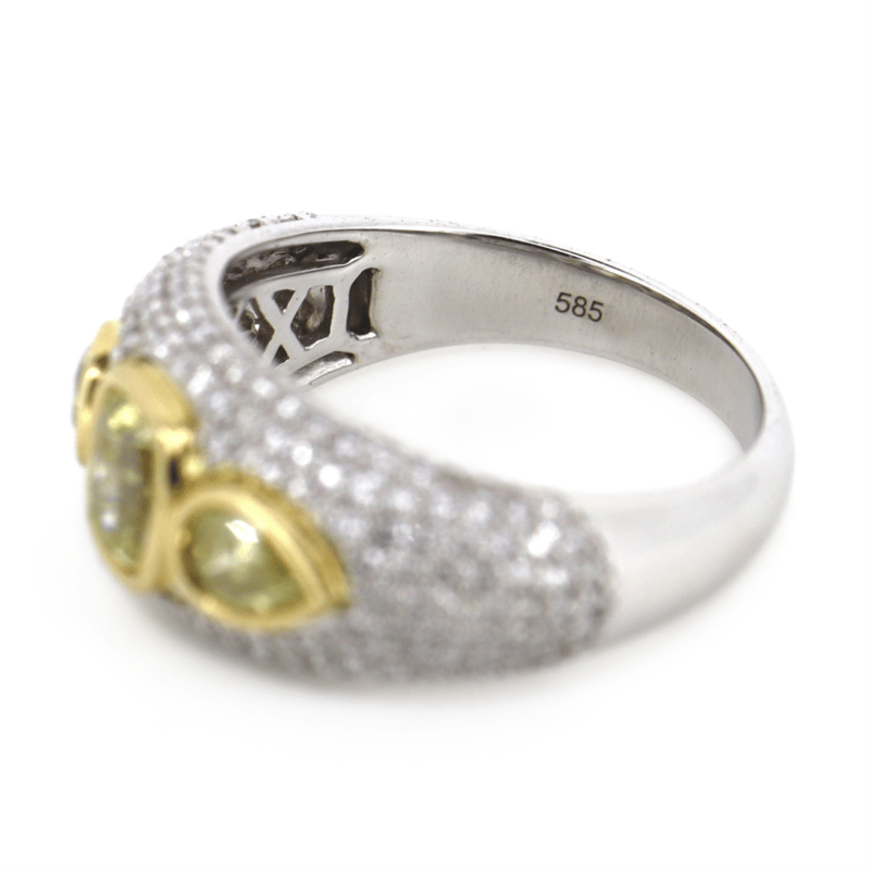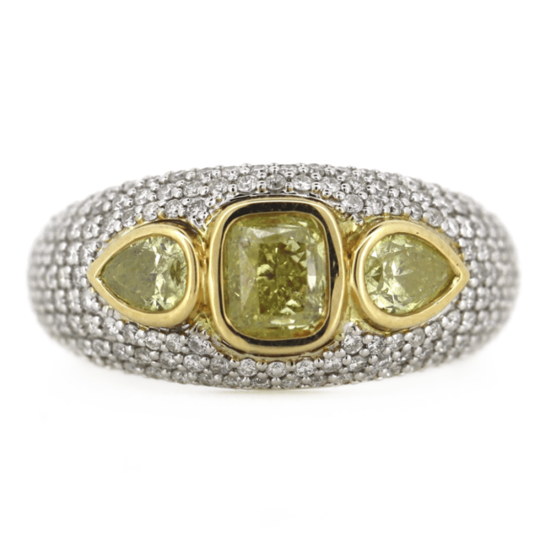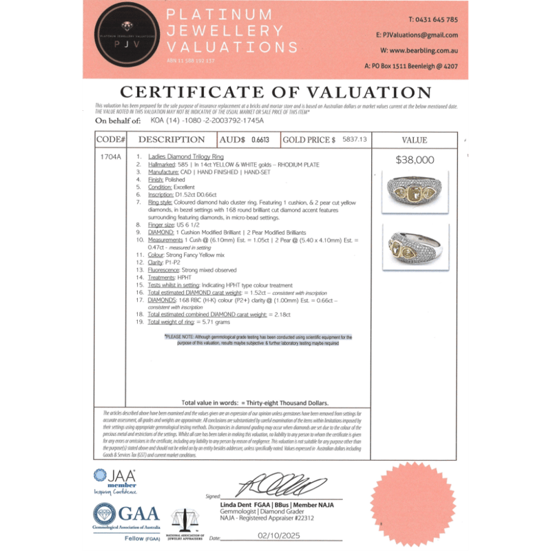 The Central Design Features, 1 Cushion Modified Brilliant Cut And 2 Pear Modified Brilliant Cut, Strong Fancy Yellow, Diamonds (1.52Ct Tdw, P1-P2 Clarity), Bezel Set. Surrounded By, 168 Round Brilliant Cut, Diamonds (0.66Ct Tdw, H-K Colour, P2+ Clarity), Micro-Bead Set. Ring Size M.