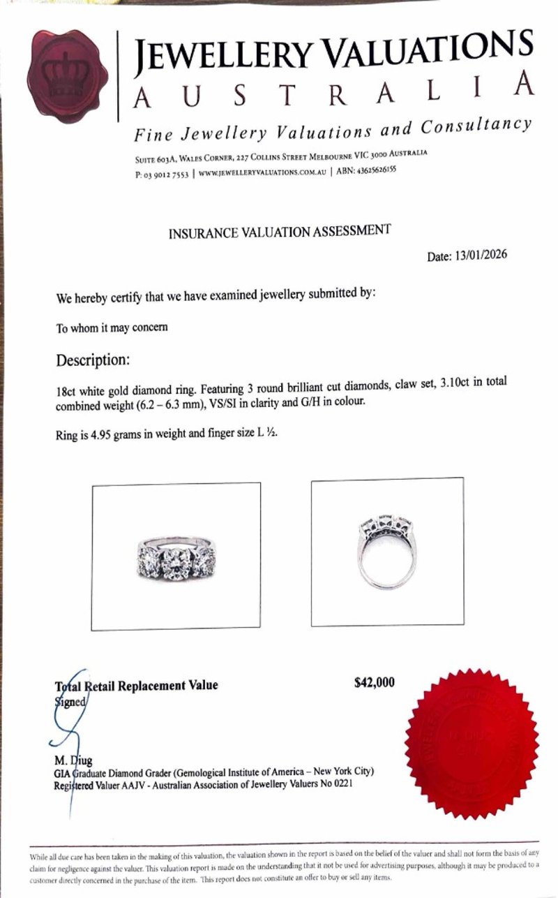 Featuring 3 Round Brilliant Diamonds, Claw Set, 3.10Ctw, Vs/Si, G/H.