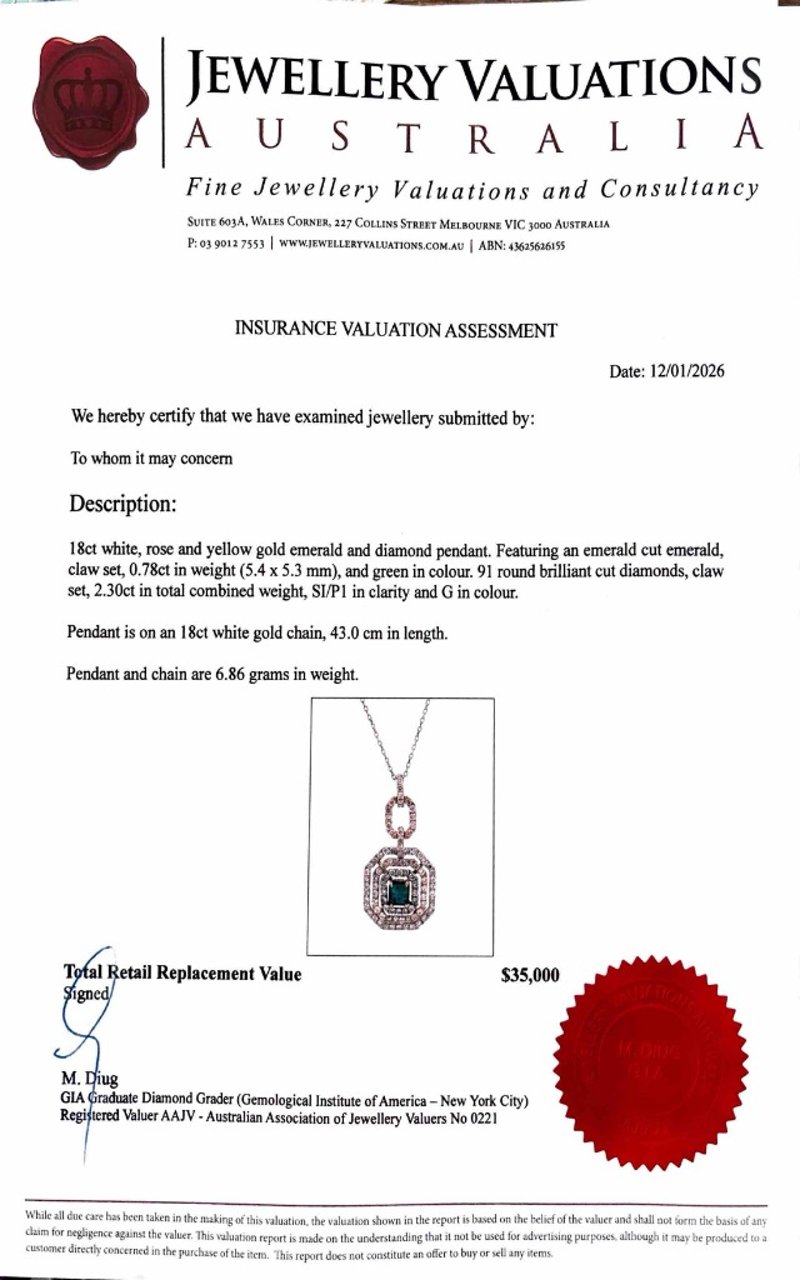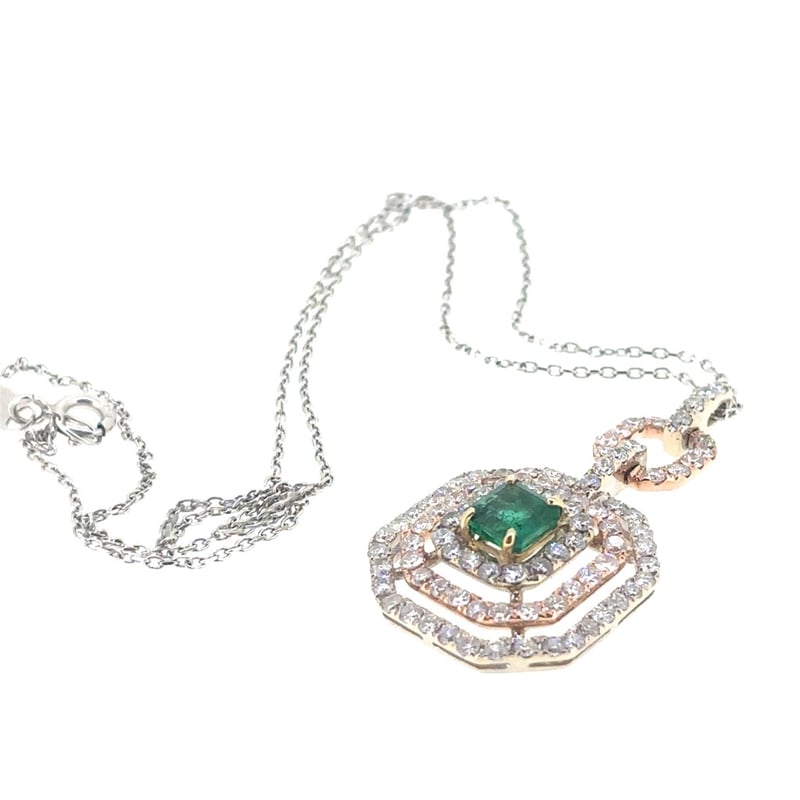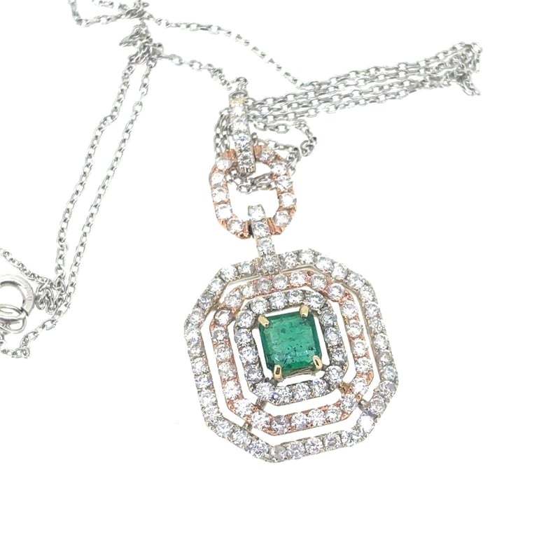 Featuring An Emerald Cut Emerald, Claw Set, 0.78Tcw, Green. 91 Round Brilliant Cut Diamonds, Claw Set, 2.30Tcw, Si/Pi, G. Pendant Is On 18Ct White Gold Chain.