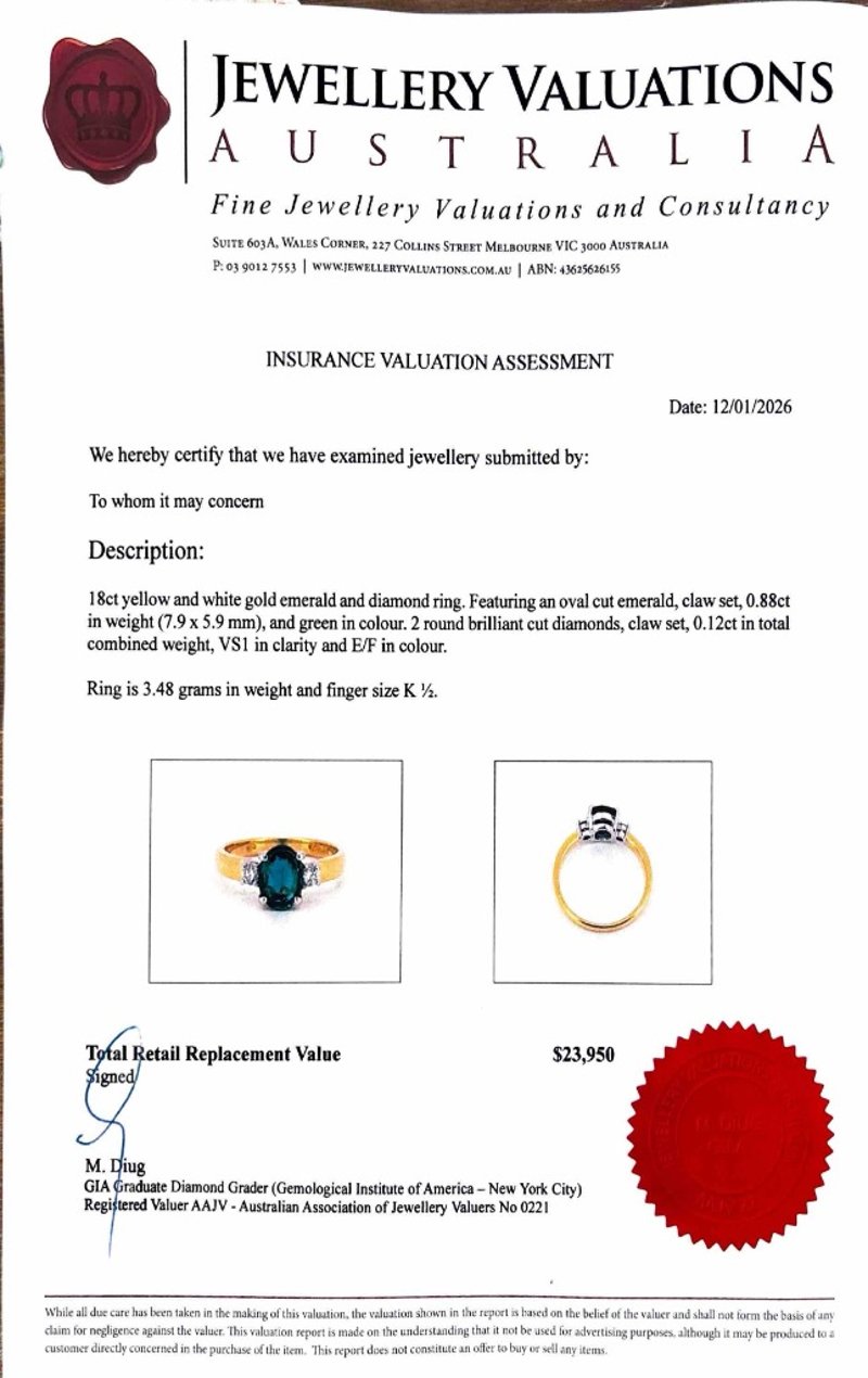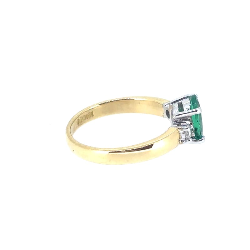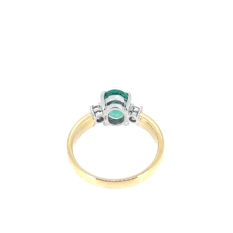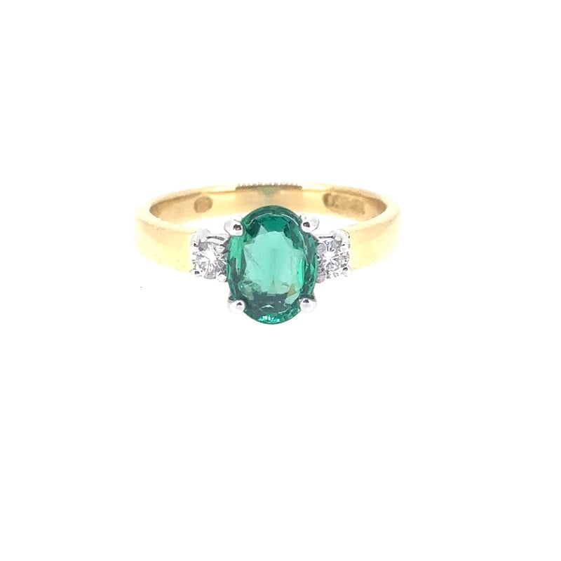 Finger Size K1/2. Featuring An Oval Cut Green Emerald, Claw Set, 0.88Ct. 2 Round Brilliant Cut Diamonds, Claw Set, 0.12Ct, Vs1, E/F.