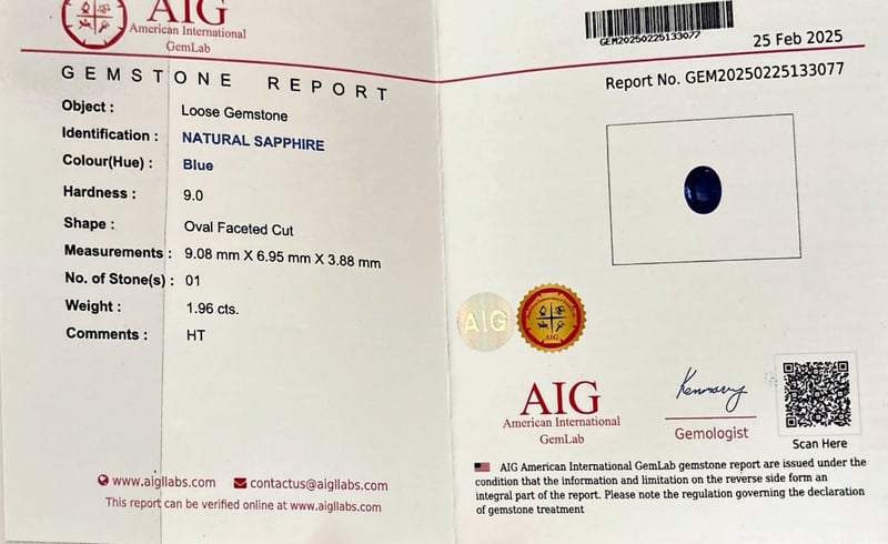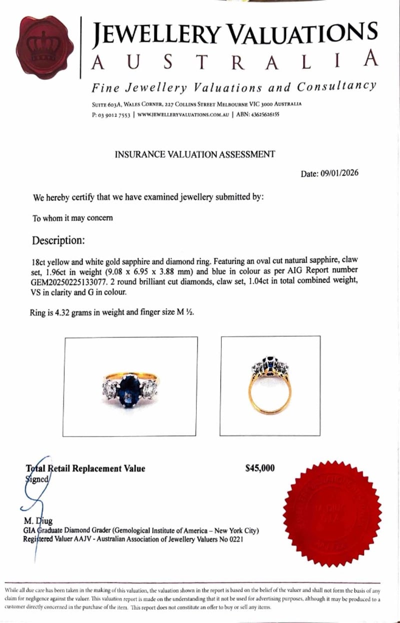 18CT YELLOW AD WHITE GOLD SAPPHIRE AND RING.Finger Size M1/2. Featuring And Oval Cut Natural Blue Sapphire, Claw Set, 1.96Ct. 2 Round Brilliant Cut Diamonds, Claw Set, 1.04Tcw, Vs, G.Accompanied By Insurance Valuation Assessment Certificate And Aig Report Gem20250225133077Total Item Weight: 4.32gDimensions: Height: 9.08mm, Width: 6.95mm, Depth: 3.88mmCondition: Good - Refer To ImagesThis valuation has been conducted by an independent third-party professional. The valuation amount is an assessment by the issuing valuer and does not reflect the auction value of the item.Any inquiries regarding the valuation should be directed to the issuing valuer (refer to contact details on the certificate), as Lloyds Auctions has no affiliation or influence over the valuation, the valuer, or the stated amount.Insurance Replacement Valuation Amount: $45,000.00CROSSDOCKED163038+15