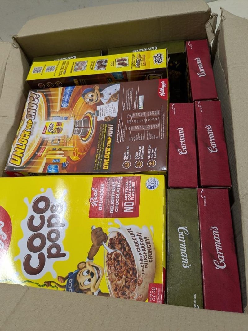 Assorted groceries items, including chocolate cereal, bars and more...Note: No guarantees are made regarding product freshness, shelf life, or usability,- Bidders are advised to inspect and verify before.