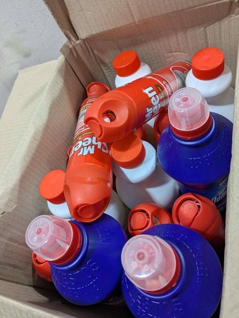 Assorted cleaning items, including multi-purpose bleach, premium bleach and more...Note: No guarantees are made regarding product freshness, shelf life, or usability,- Bidders are advised to inspect and verify before.