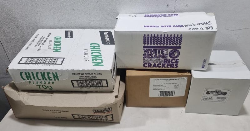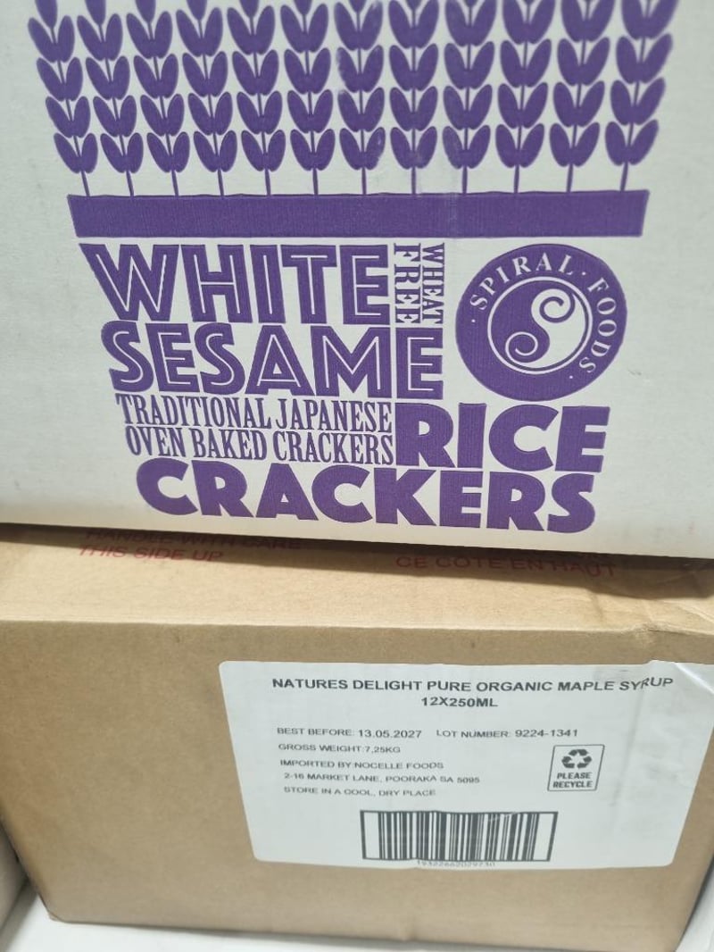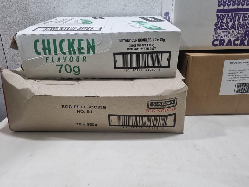 Assorted grocery Items, includes pure organice maple syrup,egg fettuccine,instant cup noodles and more ..... Sold as lot