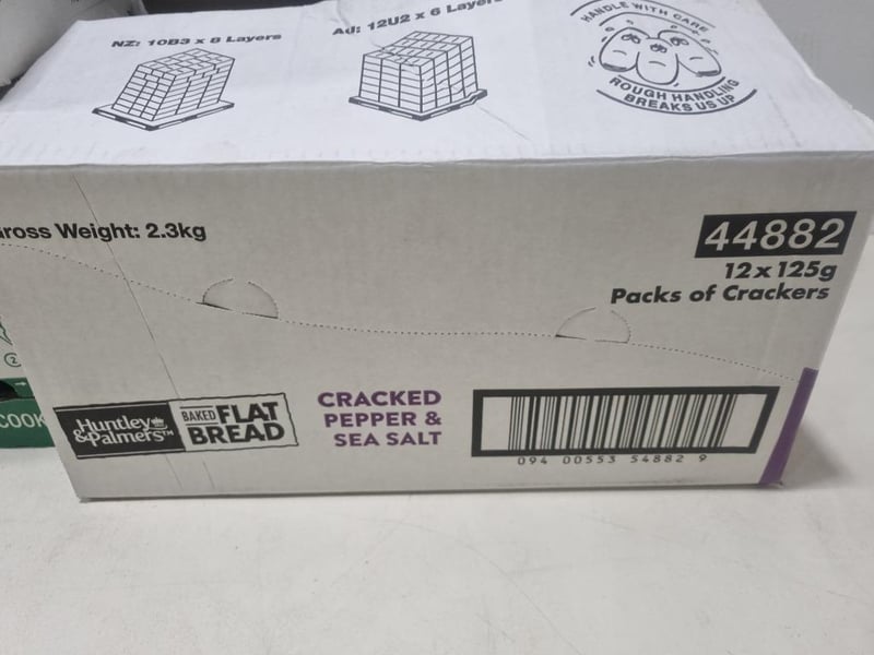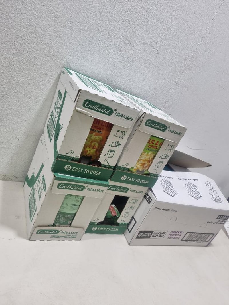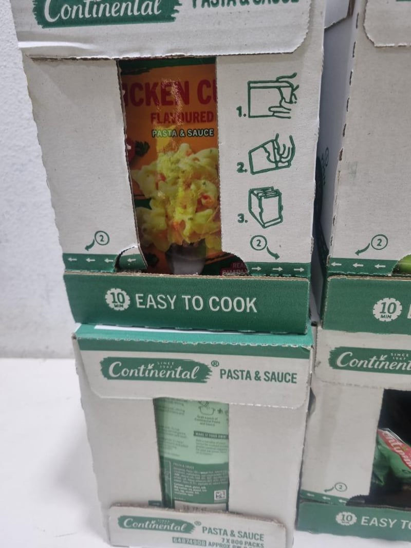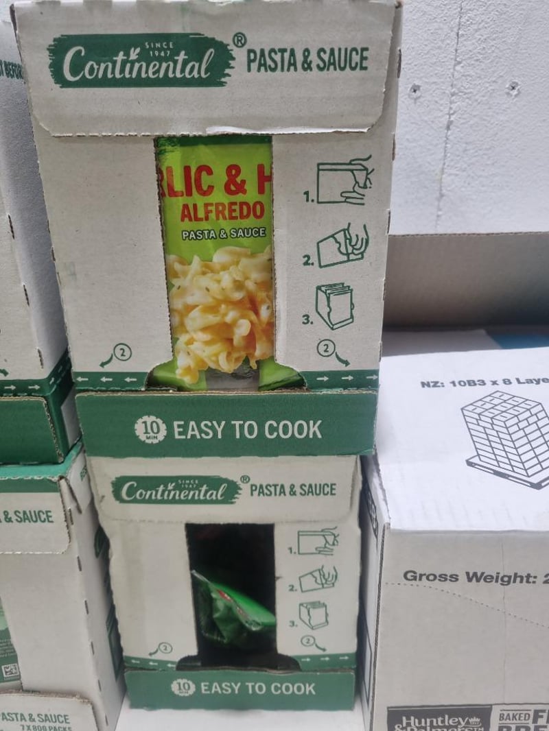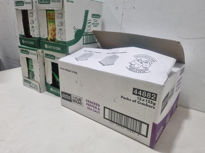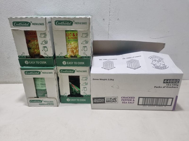 Assorted grocery items, includes Huntley and palmer's crackers and continental pasta and sauce. Sold as lot Note: No guarantees are made regarding product freshness, shelf life, or usability,- Bidders are advised to inspect and verify before.