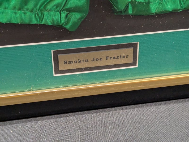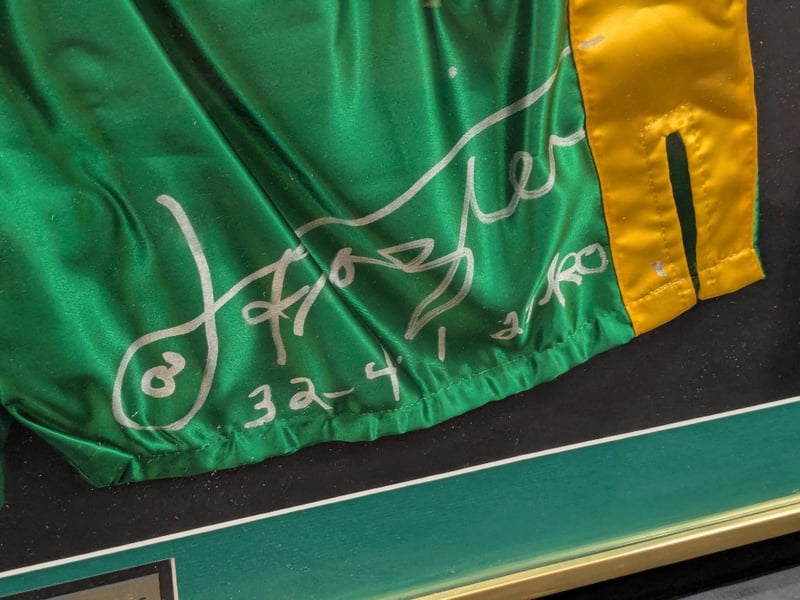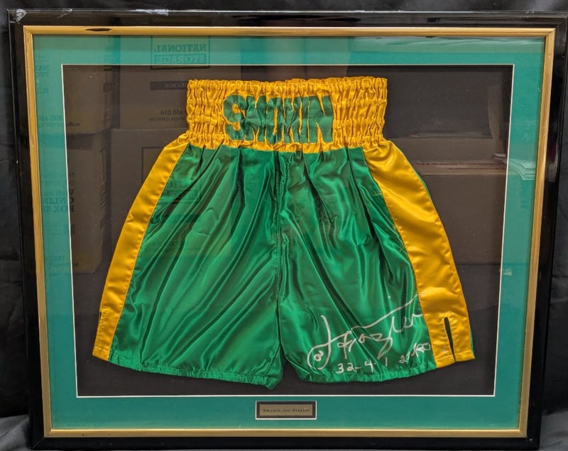 SIGNED JOE FRAZIER BOXERS IN FRAMEItem Size: Height: 73cm, Width: 86cm, Depth: 3cmIncludes Plaque With "Smokin Joe Frazier"Condition: Good - Refer To Images585026+2
