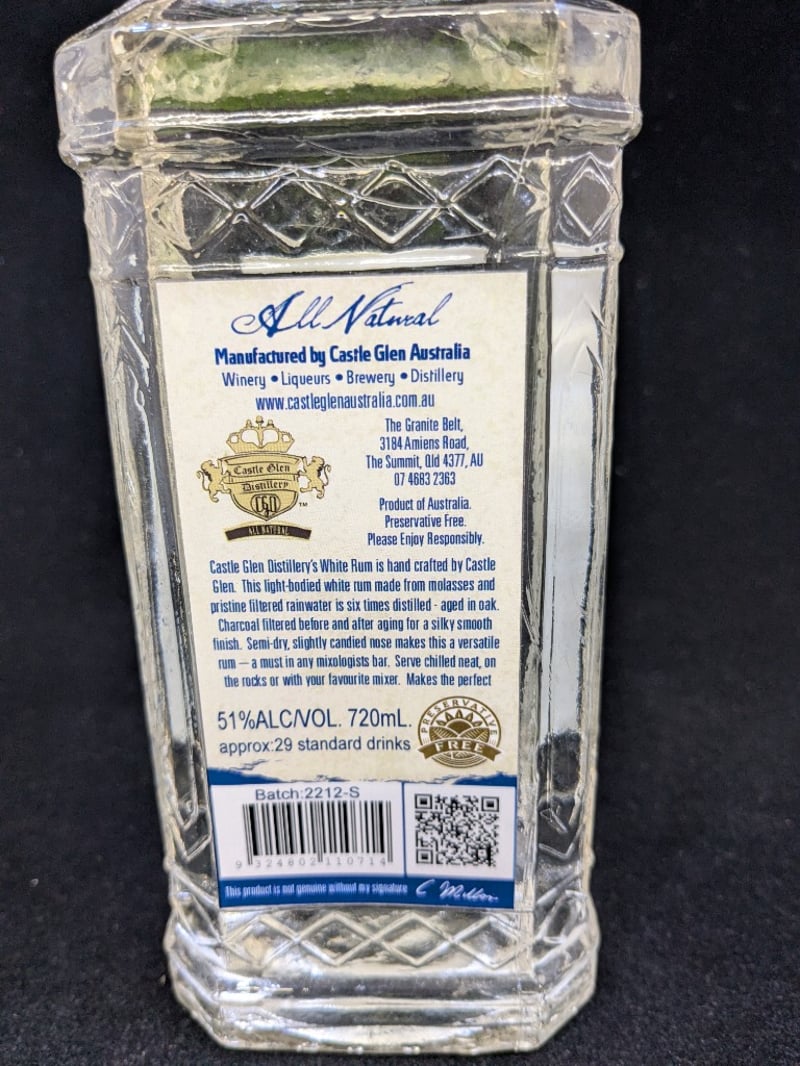 Castle Glen DistillingWhite Rum.51% ABV720ml