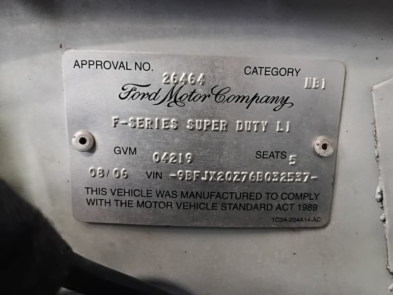 2006 Ford F-250 Year: 2006 Make: Ford Model: F-250 Body: 2-Door Drive Type: Front wheel drive Odometer: Indicating 298,880 Kilometres Engine: 5.4 V8 Petrol Transmission: Automatic Colour: White Seats: 5 Description/extras: VIN: 9BFJX20Z76B032537 ENG No: 6B032537 (Key #A19) Lloyd's stock #990935+1 #PCV
