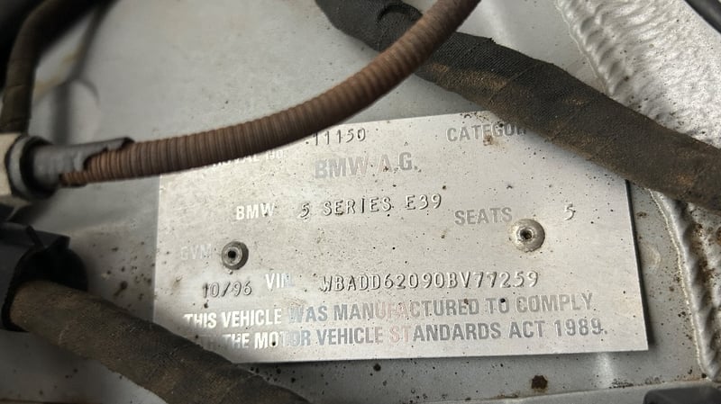 1996 BMW 528i (E39) Year: 1996 Make: BMW Model: e39 Series: E39 Badge: 528i Body: 4-Door Sedan Drive Type: Rear wheel drive Odometer: Indicating 315,028 Kilometers Engine: 2.8 I6 Petrol Transmission: 5-Speed Automatic Colour: Silver Seats: 5 Description/extras: Air Conditioning, Power windows, SRS, Power seats, Tinted windows, Cruise control, Leather interior, Climate control, Alloy wheels, Sunroof, Central locking, CD player. 1 x Key. Minor paint imperfections refer to images. Interior imperfections refer to images, Some white smoke is present from the exhaust, rear suspension minor noise, Key very worn. VIN: WBADD62090BV77259 ENG No: 286S137938534 (Key #B14) Lloyds stock #232442+1 #PCV