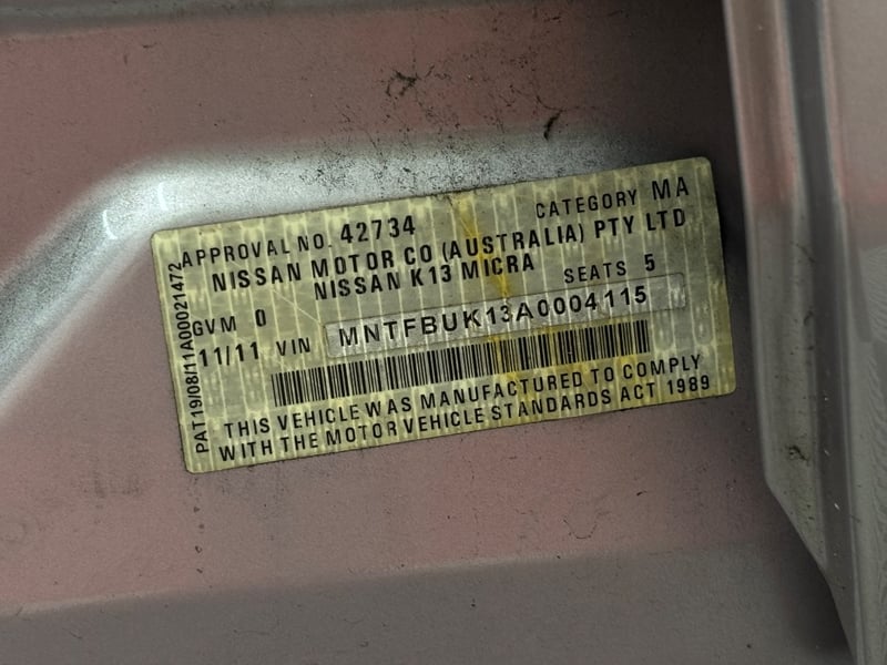 2011 Nissan Micra K13 ST Year: 2011 Make: Nissan Model: Micra Series: K13 Badge: ST Body: 5-Door Hatch Drive Type: Front wheel drive Odometer: Indicating 99,775 Kilometers Engine: 1.2 I3 Petrol Transmission: Automatic Colour: Purplish Silver Metallic Seats: 5 Description/extras: Air Conditioning, Power windows, SRS, Tinted windows, AUX / USB, CD player. Multifunctional Steering Wheel, Cupholders, Spare wheel and jack Interior: - Some marks and wear on upholstery, trim and dash - Radio Trim Dial Trim is missing as per photos Exterior: - Some panel dents and scratches as per photos - Wheel gutter rash damage as per photos - Small graze on passenger side. Price Guide - $1400 - $3000 (Based on Unmodified Vehicle) VIN: MNTFBUK13A0004115 ENG No: HR12380924A AS PER PPSR #PCV (Key #A44 Carrara) Lloyds stock #1036106+1