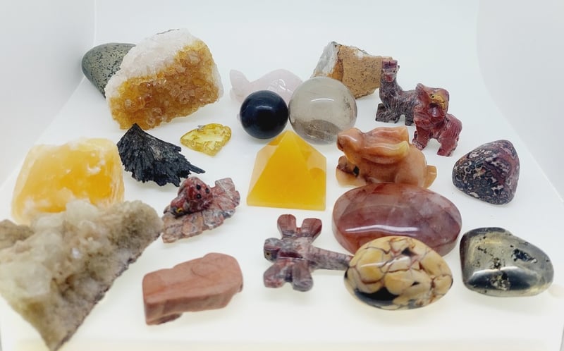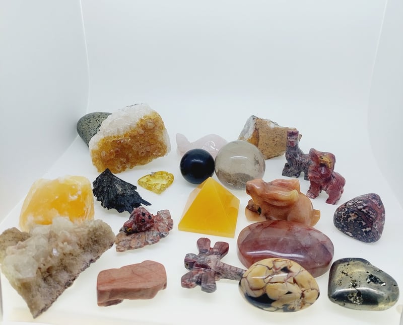 ASSORTED CRYSTALS INCLUDING ORANGE CALCITE, STRAWBERRY QUARTZ AND MORE...SOLD AS A LOT.Condition: Good - Refer To Images488378+22