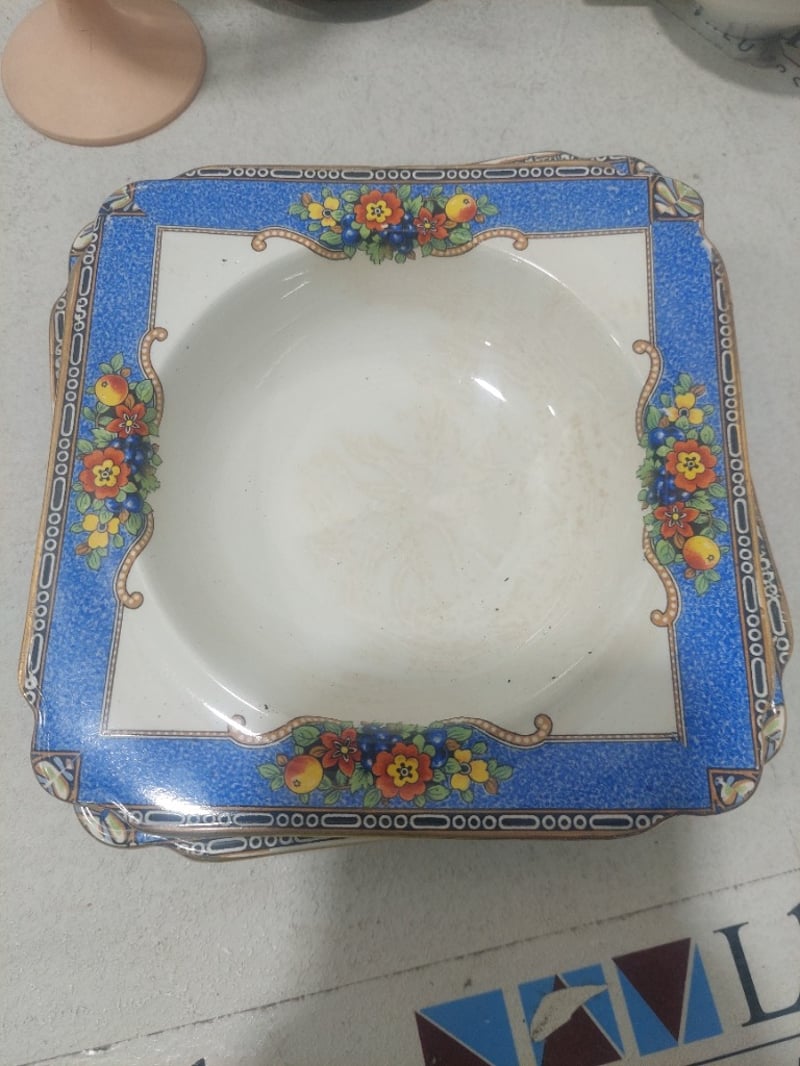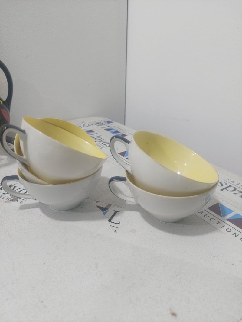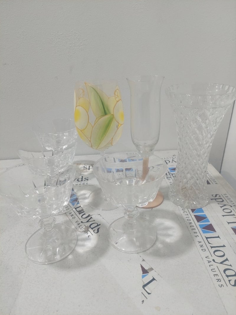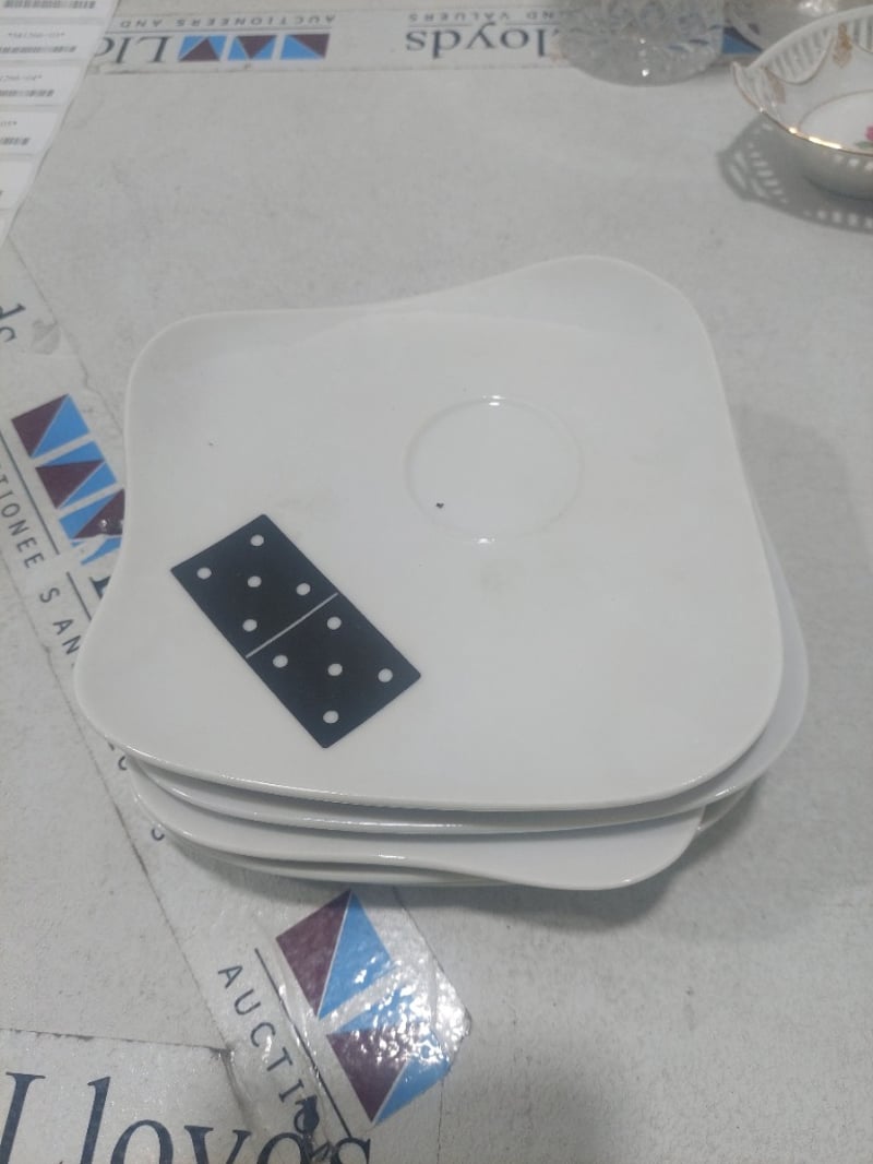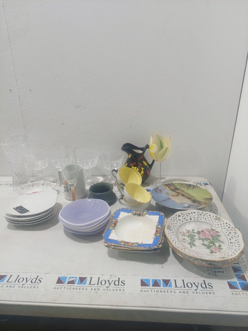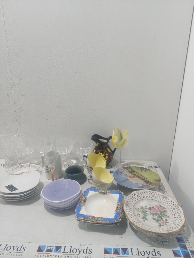 Assorted ceramic crockery. Includes plates saucers, glasses and cups.Sold as lot.