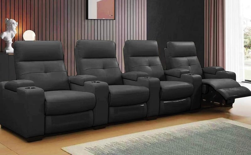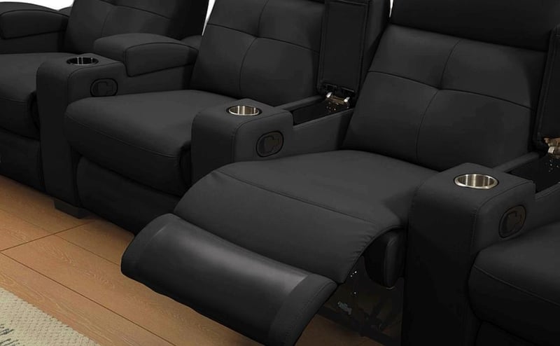 Arena - 4 Seater Home Theatre Reclining Lounge, Black RRP: $8,899Designed to provide the best spectator experience at your favourite sports events, concerts, and movies, the Arena is a premium Home Theatre reclining lounge that ticks all the boxes! Wide ergonomic adjustable seats, each with reclining backrest and a fold out footrest. Each seat enjoys a drink holder and a personal storage compartment on both sides, and comes with a protective footrest cover, which can be removedAccording to individual space and requirements this 4 seater set can be easily reconfigured into a 3 seater or a 2 seater (but NOT into 2+2, and NOT into 3+1)A truly bold lifestyle statement and great comfort, that puts you in the best seat on every occasionSmooth reconstituted leather on front partsMatching grain synthetic leather on rear and hidden partsAdjustable reclining backrests on all 4 seatsAdjustable fold out footrests on all 4 seats5 cup holders with stainless steel finish5 individual storage compartments with lidsProtective footrest covers, which can be removedEasily customisable into a 3 seater or a 2 seater External measurements: W 341cm x D 94cm x H 101cmColour: Black