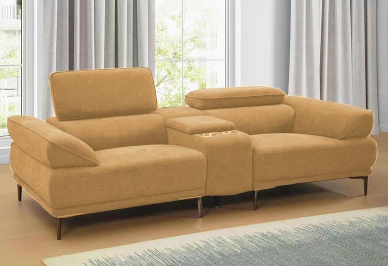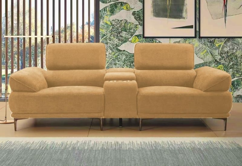 Preview - 2 Seater Media Lounge, Camel RRP: $3,280The Preview is a unique media lounge, designed to create a comfortable cosy spot in any media room or gaming room.Its deep wide seats, with padded armrests and adjustable headrests, offer an inviting space to immerse yourself in favourite content, while keeping drinks and snacks conveniently within reach.High quality wool and cotton blend upholstery2 adjustable headrests2 cup holders with stainless steel finish2 extra wide padded armrestsMiddle arm storage compartment with lidExternal measurements: W 220cm x D 102cm x H 72/92cmColour: Camel
