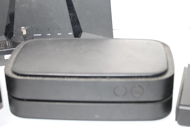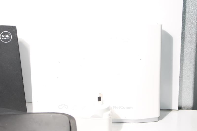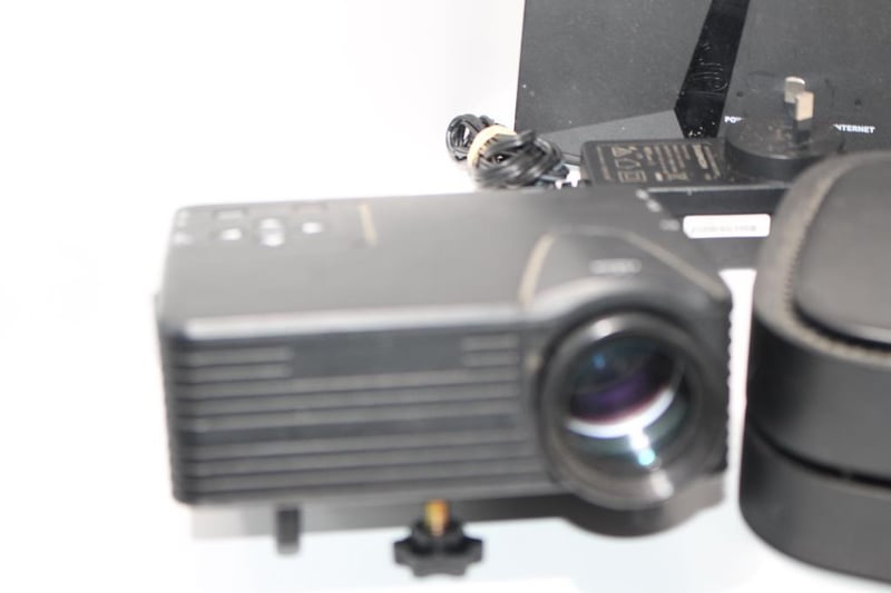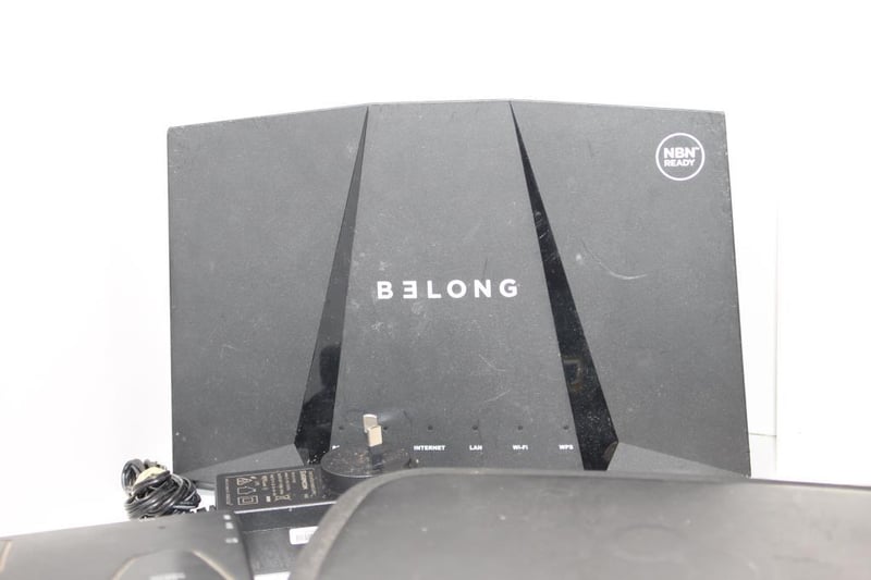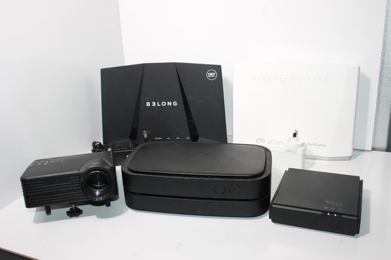 Mixed Electronics Lot – Belong, NetComm, Projector, Media Boxes (5 Units)All untested and in varying condition – includes Belong NBN router, NetComm router with plug, compact projector, media box, and a large black set-top unit.