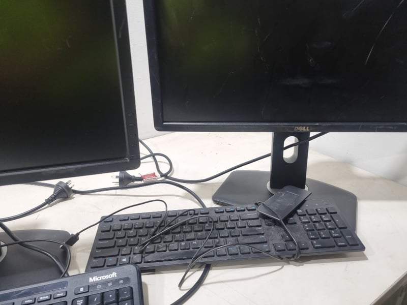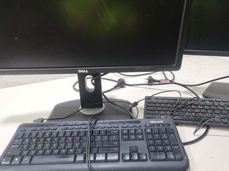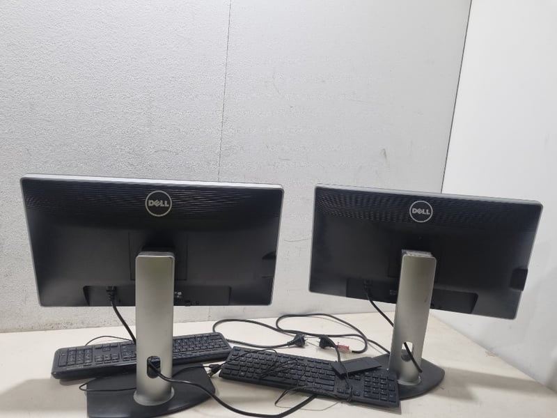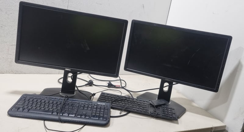 Dual Dell Monitor Workstation Setup comprising two Dell flat-screen monitors (approximately 22-24 inches each) with adjustable stands featuring silver pedestals, mounted on a white desk surface. Includes two wired keyboards (Microsoft brand and additional standard keyboard) and associated peripherals. The monitors display Dell branding and are equipped with black bezels. Cables are neatly bundled. This is a complete, functional dual-display workstation suitable for office, creative, or professional computing tasks requiring extended screen real estate. Both monitors appear operational with integrated stands allowing height and tilt adjustment.Note: untested