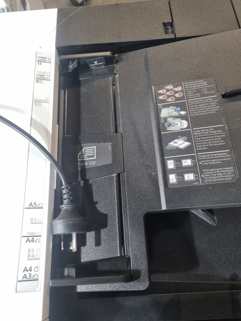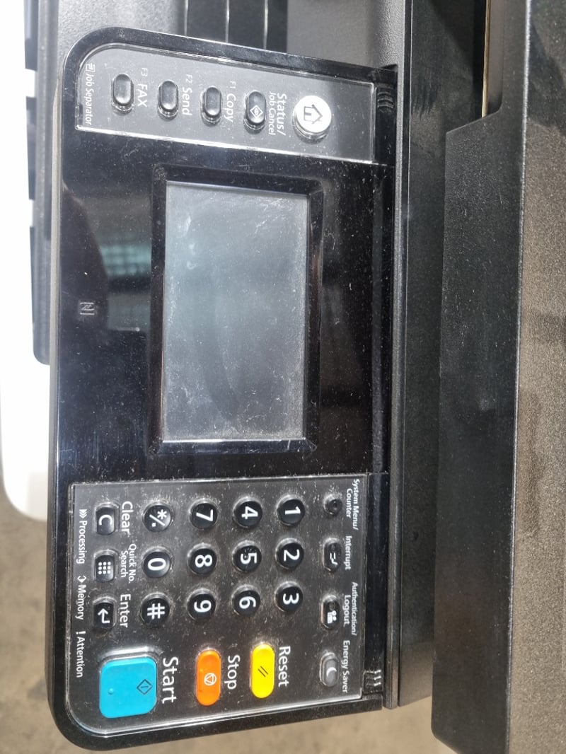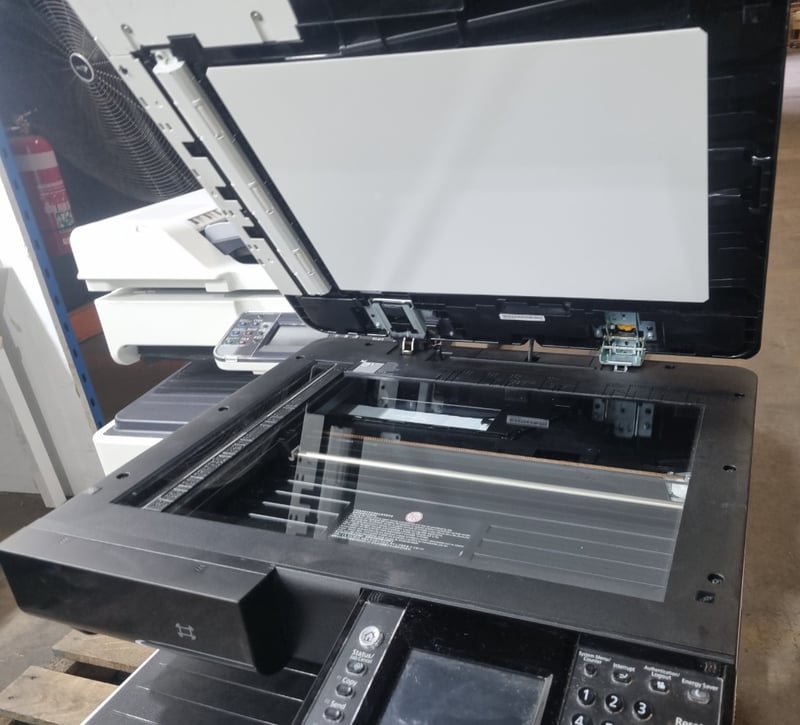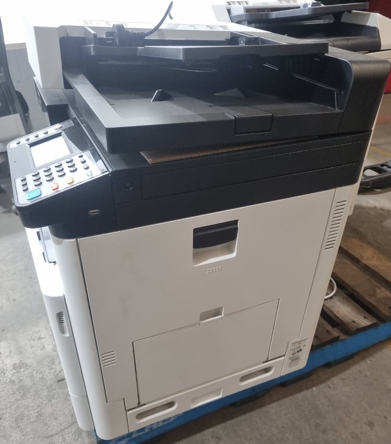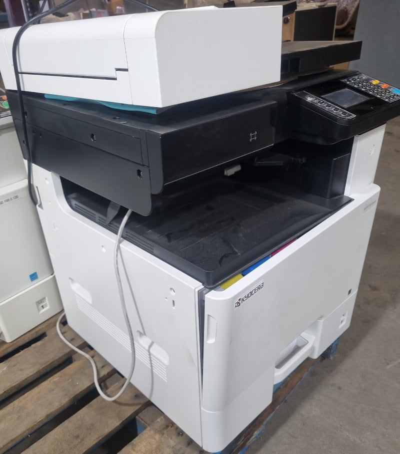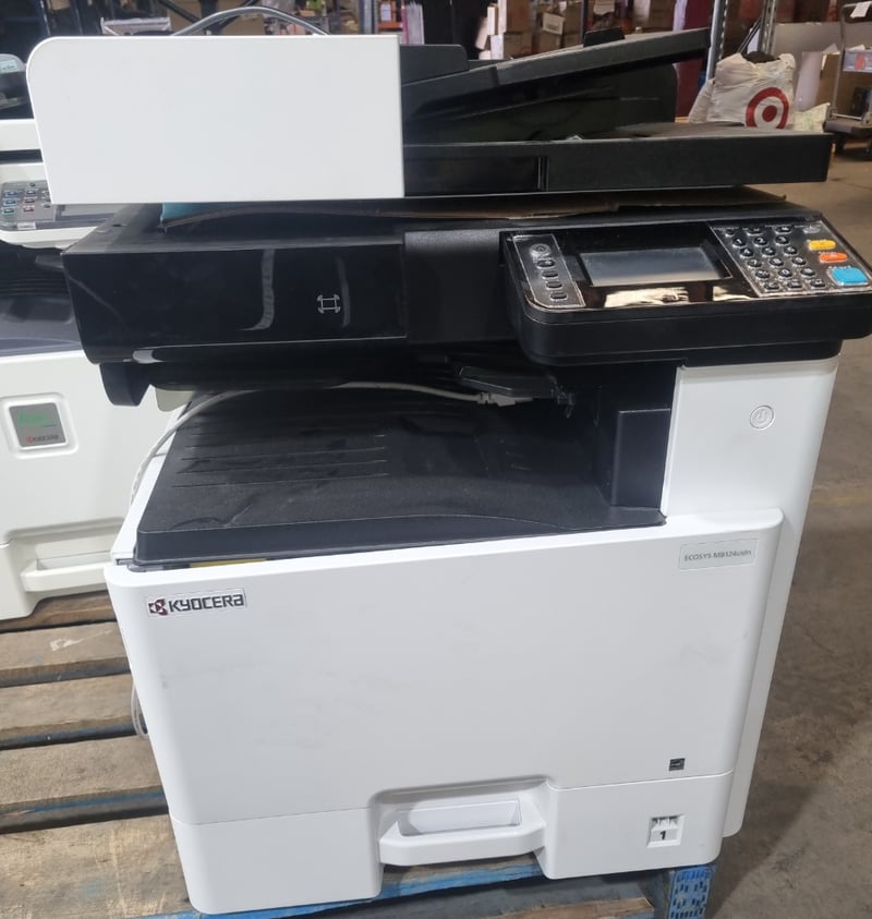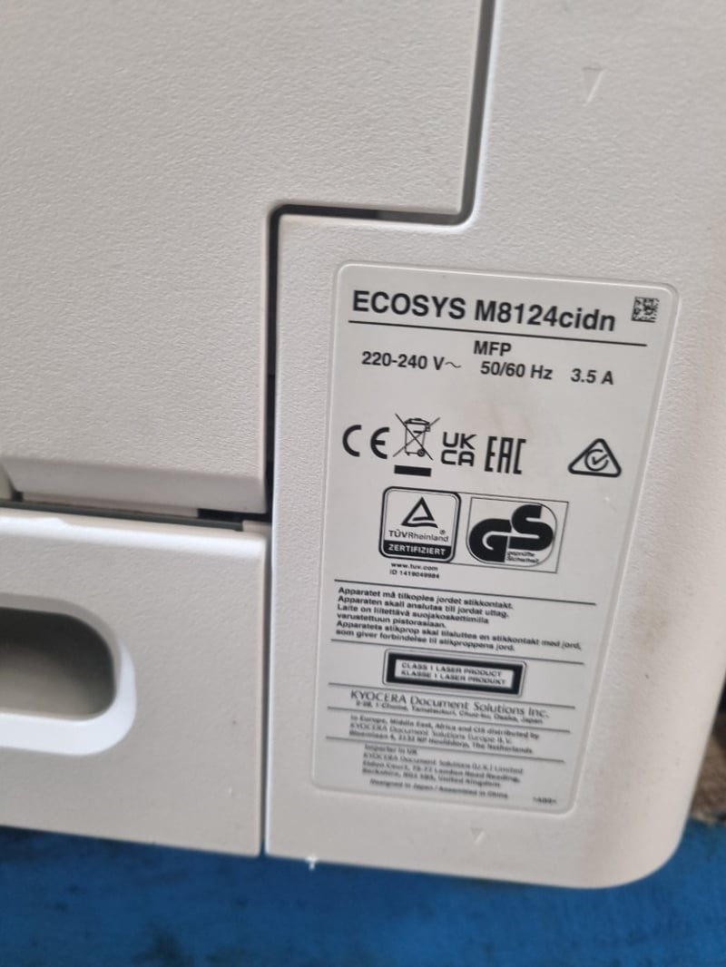 Kyocera ECOSYS M8124cidn multifunction colour printer/copier/scanner. White and black design with integrated document feeder and automatic duplex printing capability. Features touchscreen control panel with numeric keypad and dedicated function buttons (Start, Stop, Reset). Includes paper tray system supporting multiple paper sizes (A3, A4, B4, B5, Folio). The device demonstrates professional office-grade specifications with scanning, copying, printing and finishing functions. Equipped with 220-240V electrical connection and operational control switch on rear panel. Shows evidence of regular workplace use.Note: untested