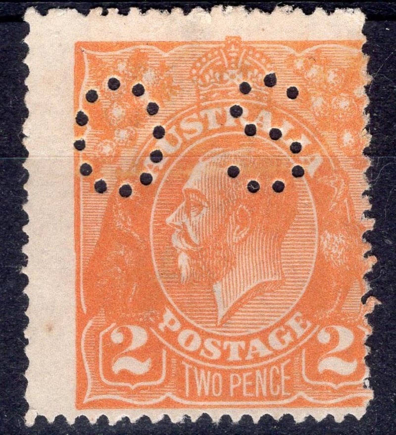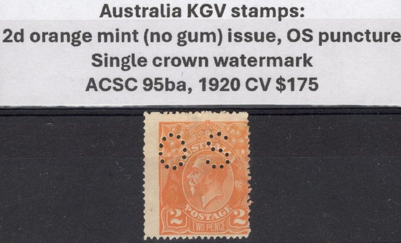 Australia KGV stamps: 2d orange mint (no gum) issue, OS puncture, single crown watermark, ACSC 95ba, 1920.