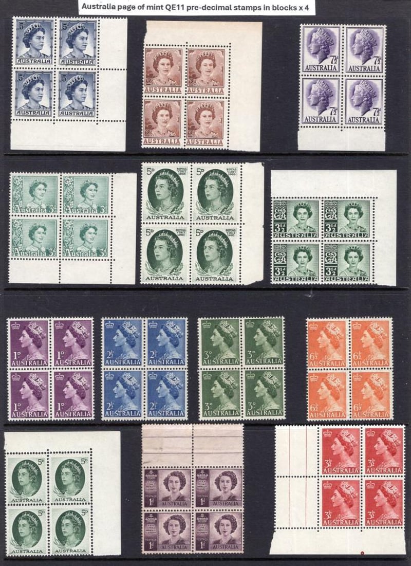 Australia page of mint pre-decimal Queen Elizabeth stamps in blocks x 4