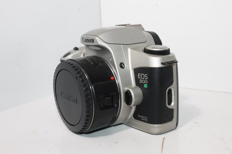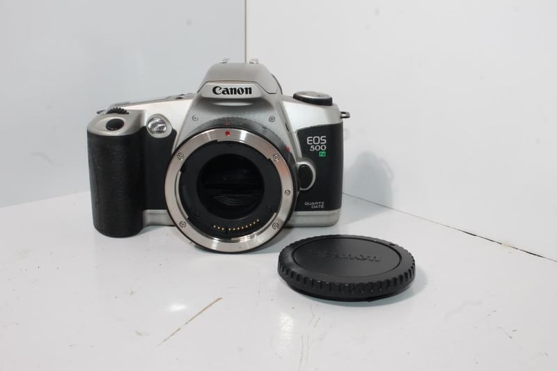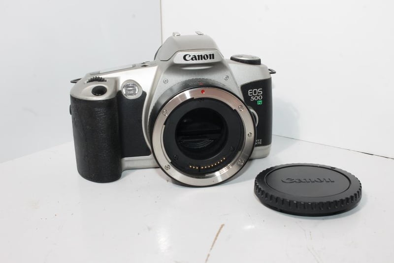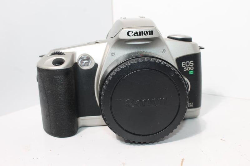 Canon EOS 500N 35mm Film CameraUsed condition with cosmetic wear from age and handling. Includes Canon EOS 500N body with body cap.