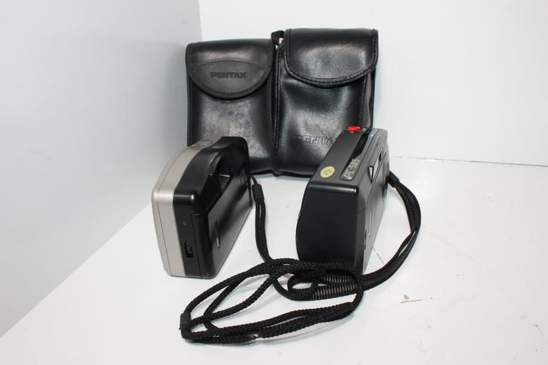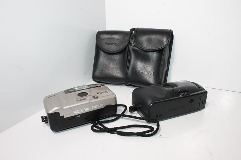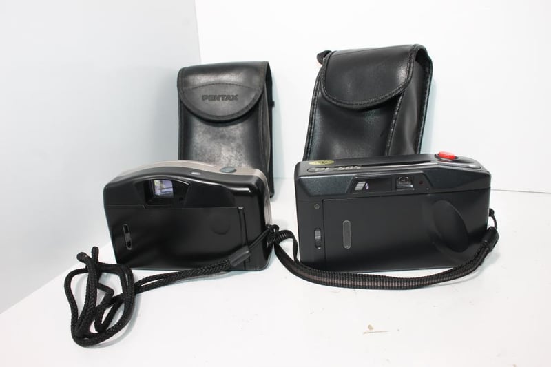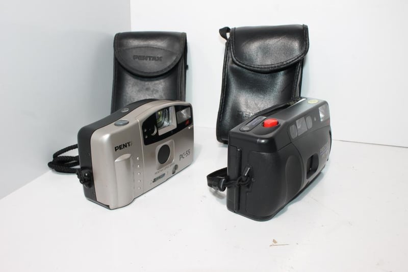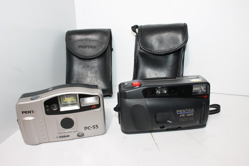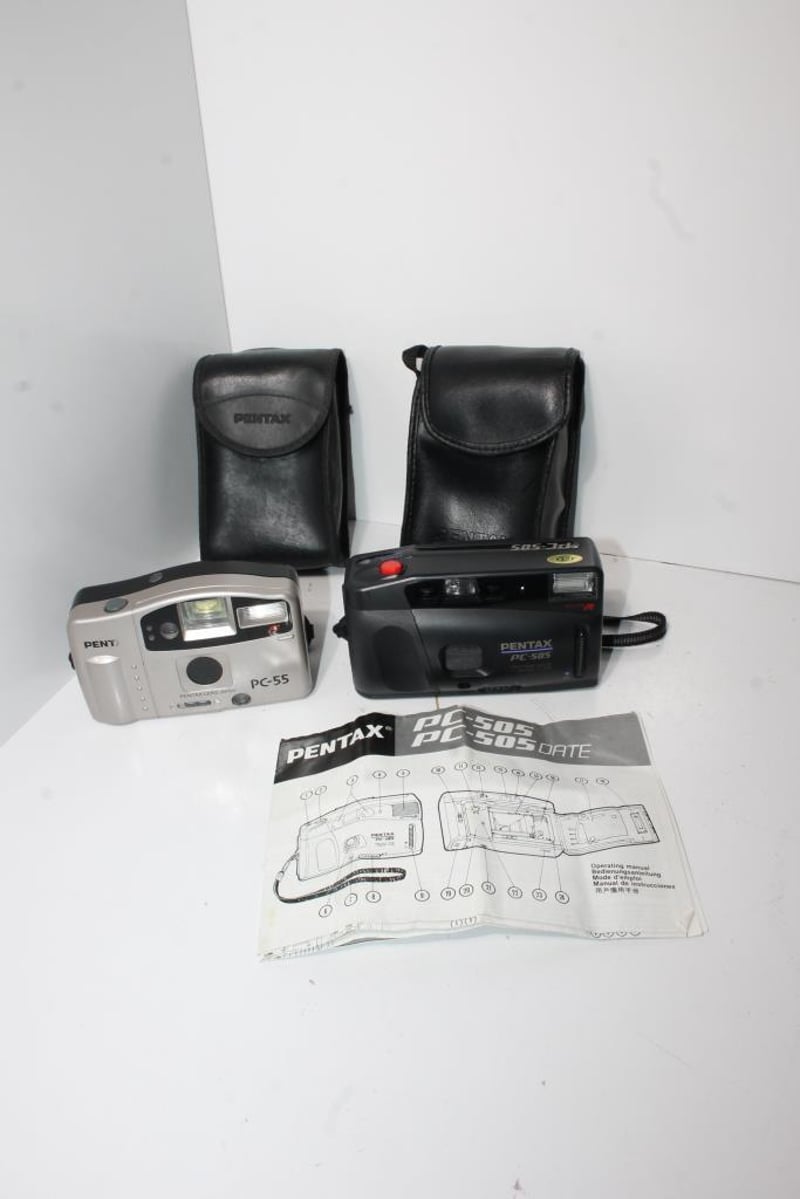 Pentax Film Camera Pair – PC-55 & PC-505SIncludes two vintage 35mm film cameras with Pentax cases. Overall used condition with instruction sheet included.