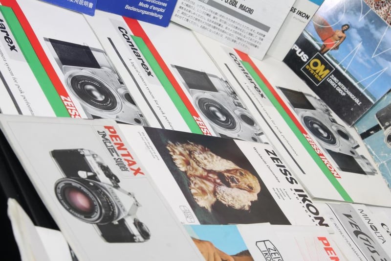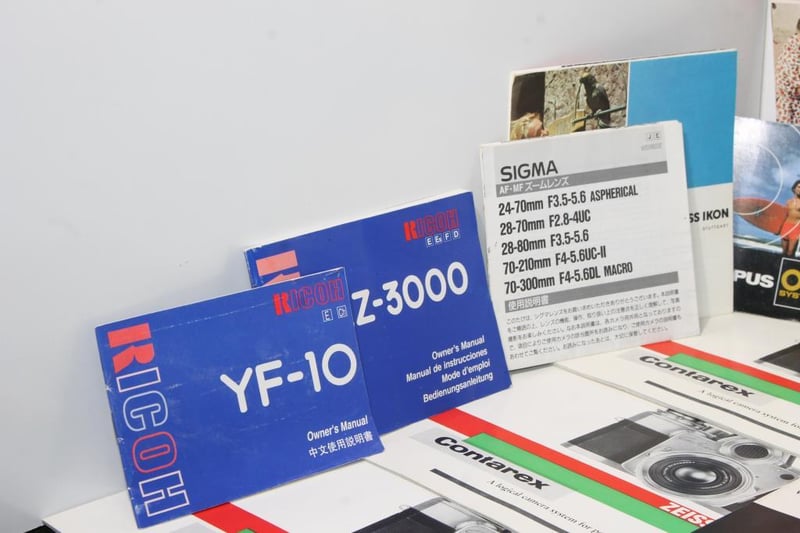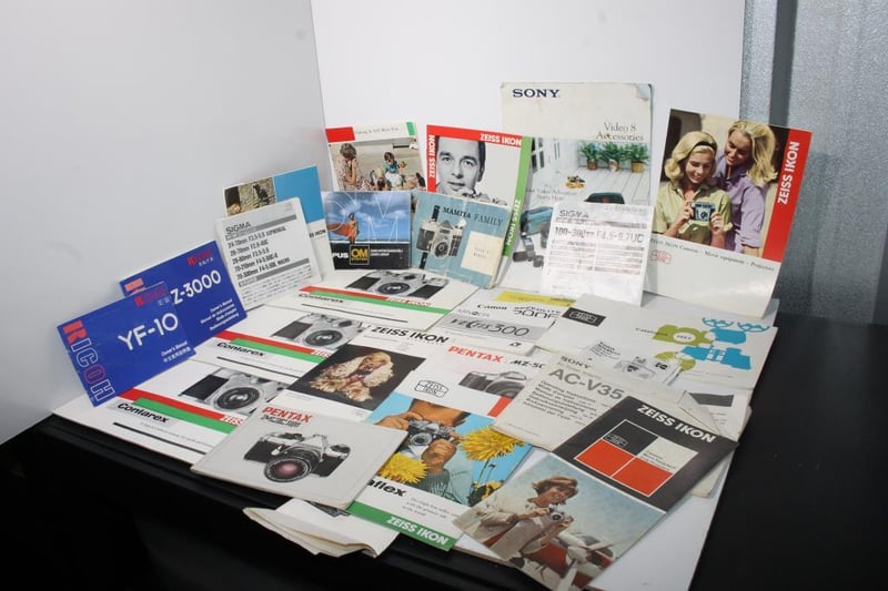 Vintage Camera Manual & Brochure Lot – Zeiss Ikon, Sony, Pentax, Ricoh, Mamiya, Sigma & More (Large Mixed Collection)Extensive assortment of vintage camera manuals, brochures and lens instruction sheets covering brands such as Zeiss Ikon, Pentax, Ricoh, Olympus, Mamiya, Canon, Minolta, Sony Video 8, Sigma and others, with items ranging from user guides to promotional booklets.A broad collector’s mix ideal for photography enthusiasts, restorers or display archives, supplied exactly as shown across all documents.