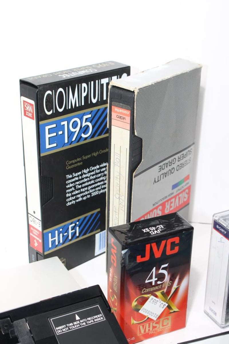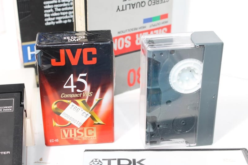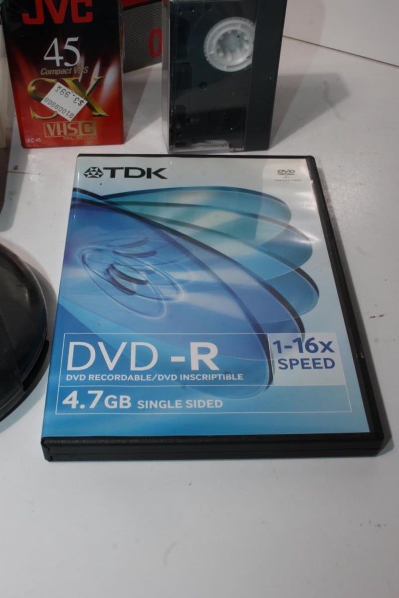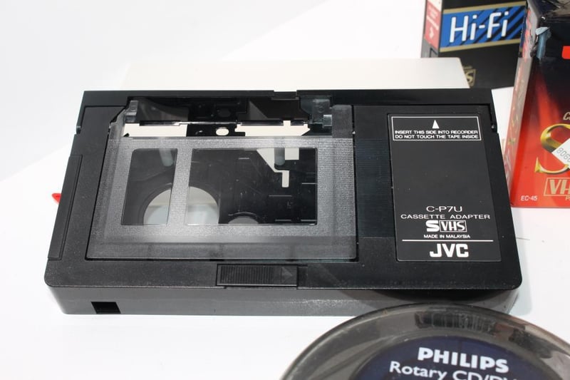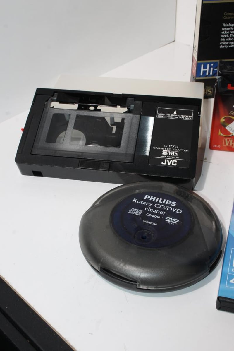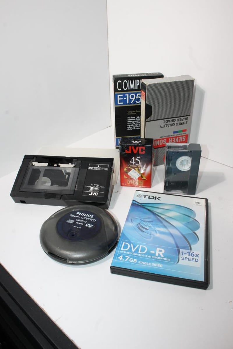 VHS Tapes & Media Accessories Lot – Mixed BrandsIncludes a JVC C-P7U VHS-C to VHS cassette adapter, Philips rotary CD/DVD cleaner, blank TDK DVD-R disc, a compact VHS cassette, and two full-size VHS tapes as shown.Good mixed lot of analogue media and accessories ideal for collectors, archivers, or spare parts.