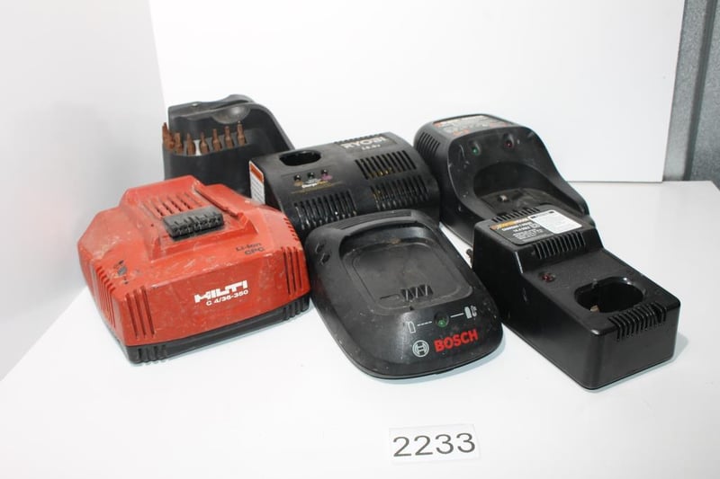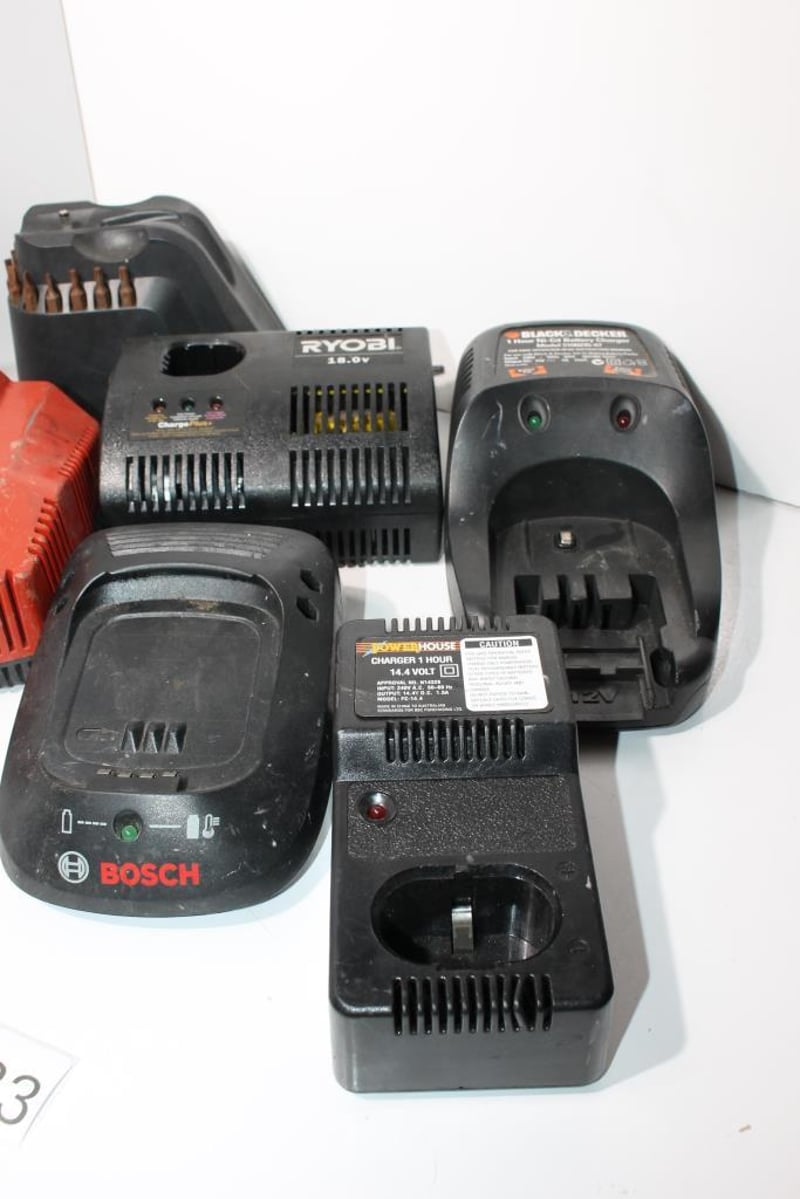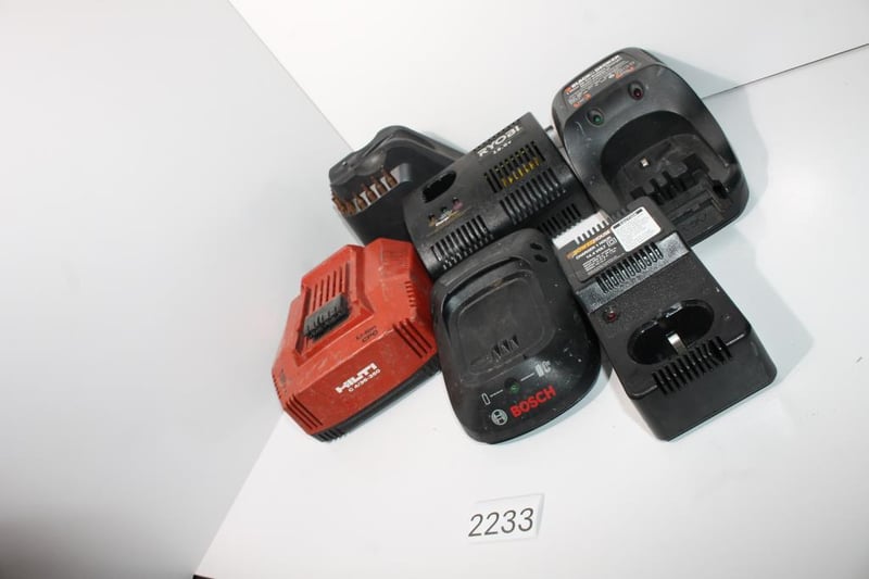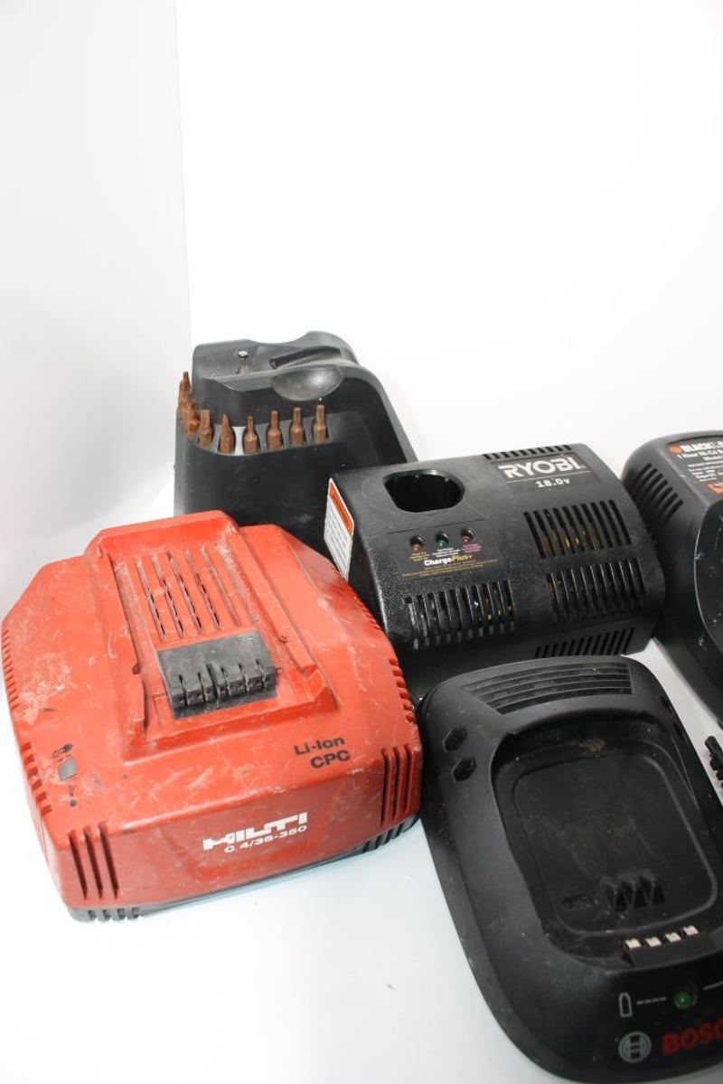Power Tool Battery Chargers – Hilti, Ryobi, Bosch, Black & Decker, Powerhouse (6)All untested and in varying condition; require new cords – mixed lot of 6 power tool battery chargers including Hilti Li-Ion CPC, Ryobi 18V, Bosch, Black & Decker, Powerhouse 14.4/18V, plus one unidentified unit as pictured.