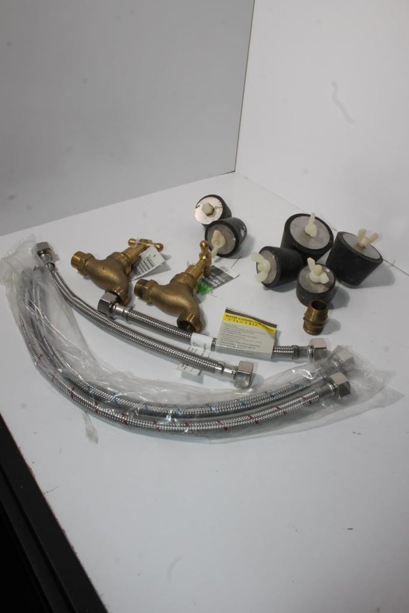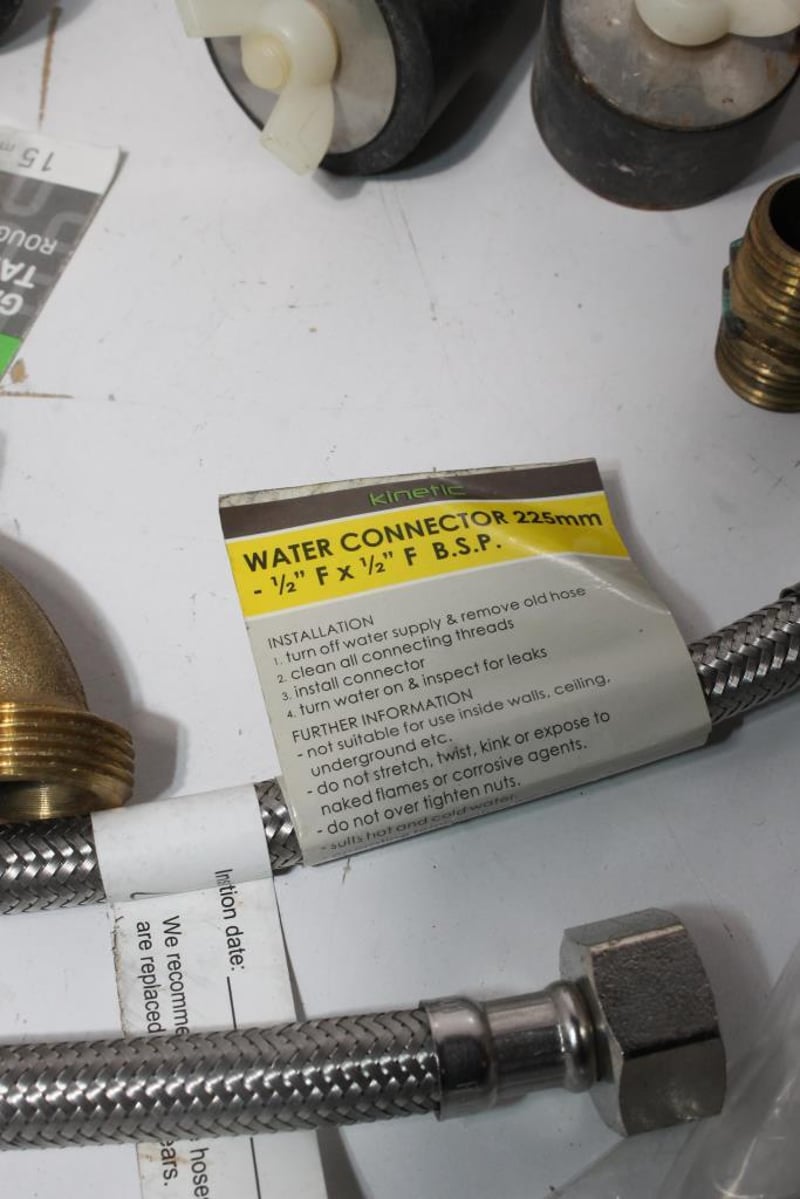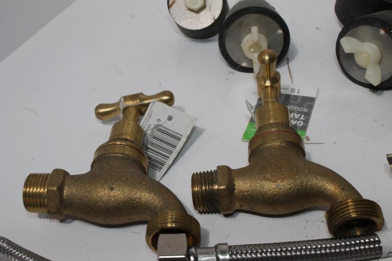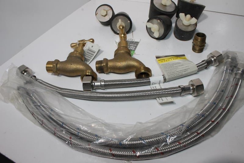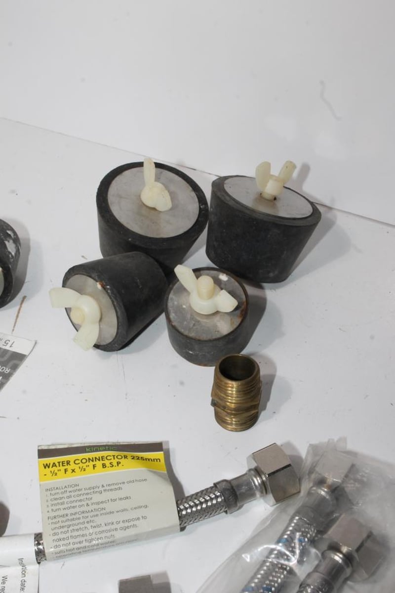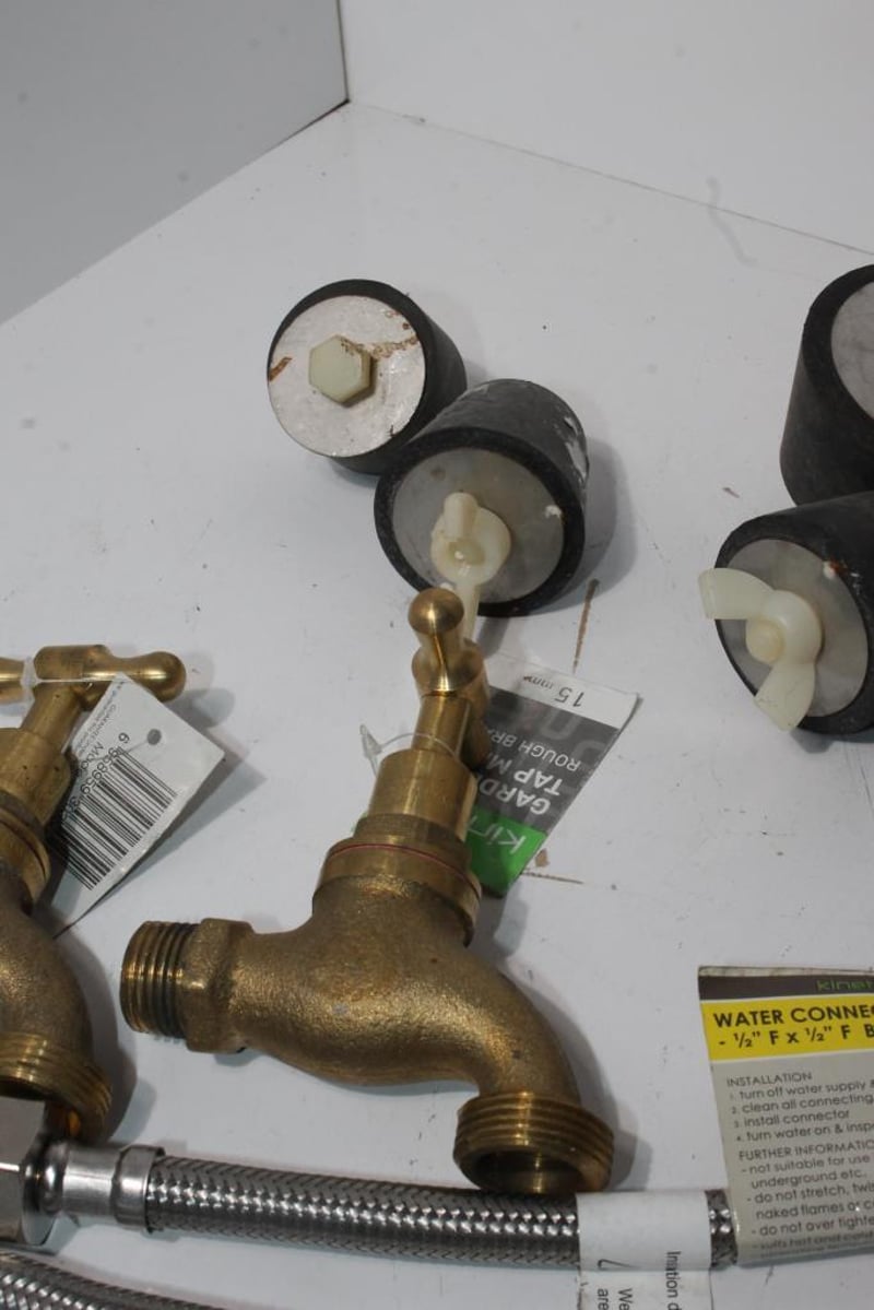 Plumbing Parts Lot – Rubber Test Plugs, Brass Fittings & Flex Hoses (1 Lot)Includes multiple rubber pipe test plugs with wing-nut expanders, brass threaded fitting, a pair of brass garden tap bodies, and several stainless-steel braided flex hoses (some sealed), along with connector labels shown.Mixed range of plumbing components suitable for repairs, installations or spares, supplied exactly as photographed.