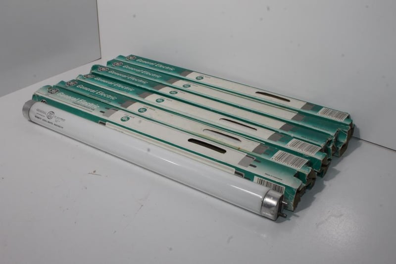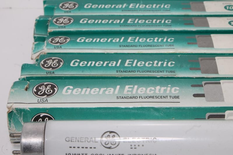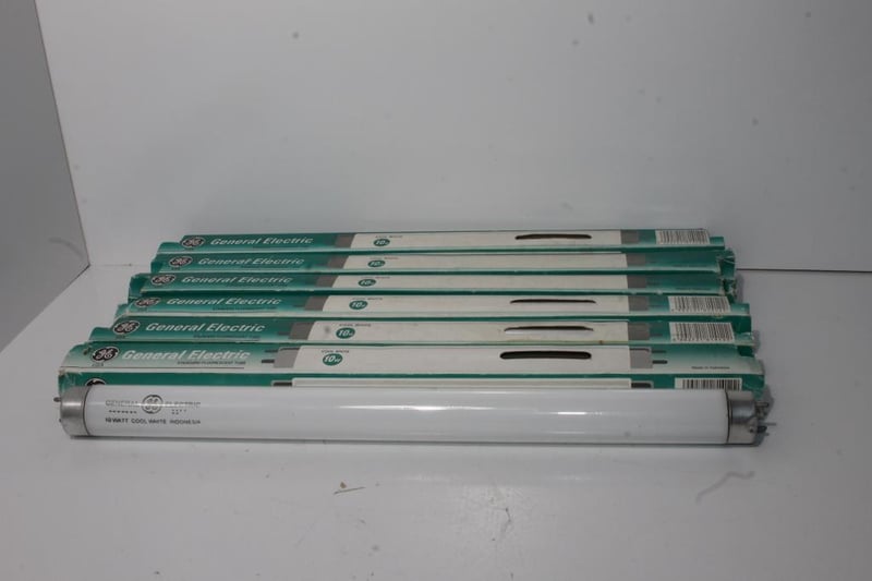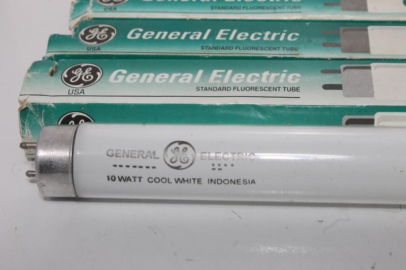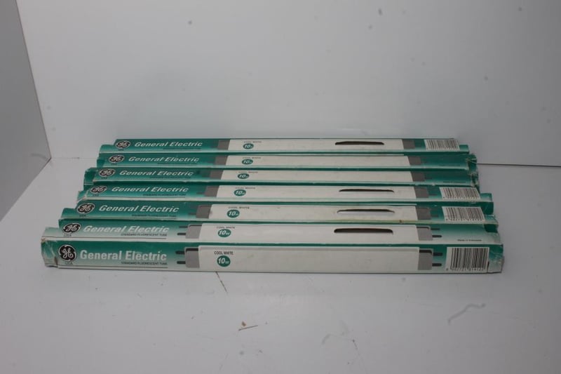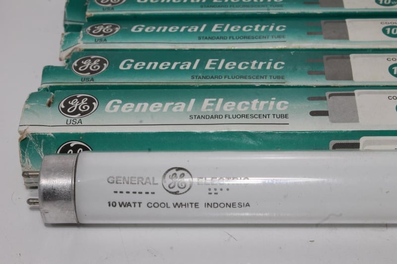 GE USA Fluorescent Tubes – 10W Cool White (33cm) – Lot of 6Six General Electric 10W cool-white fluorescent tubes with original GE USA-branded sleeves.Presents in stored condition; tubes appear unused but packaging shows age and handling wear.