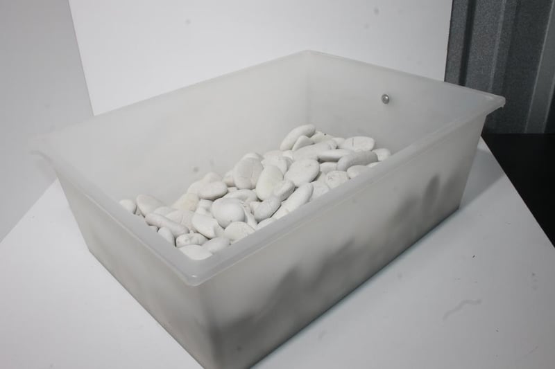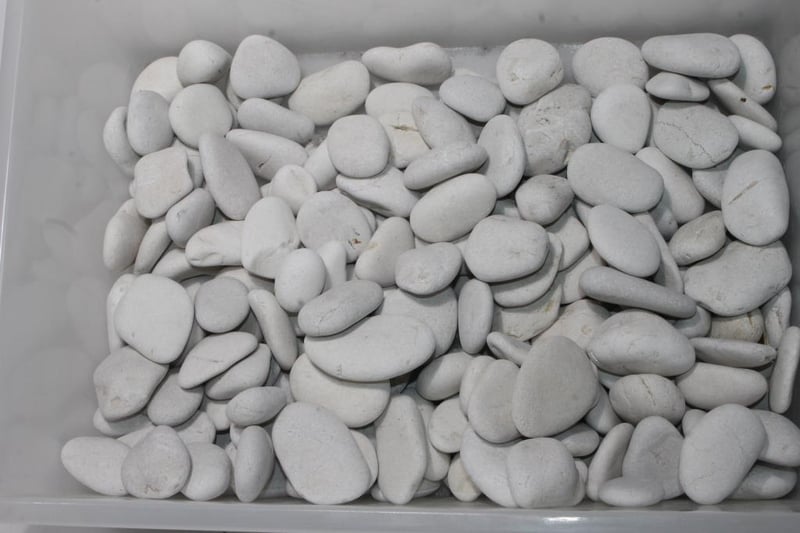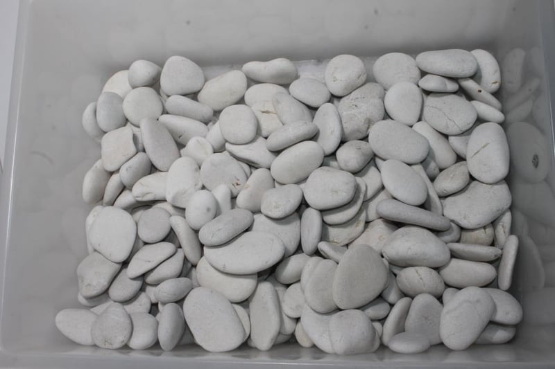 White Decorative Stones – Mixed Smooth Pebbles (Approx. 7kg)Large tub of white decorative stones suitable for craft, display or garden use.Presents in used condition with assorted shapes and natural markings.