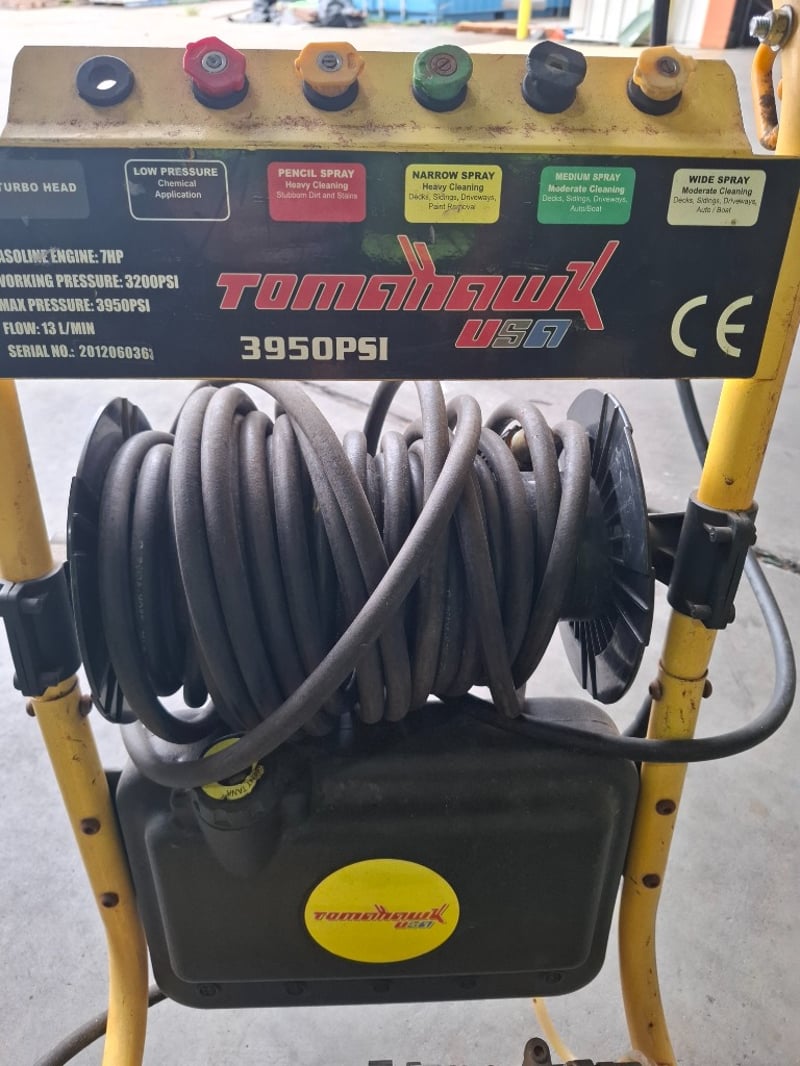 Tomahawk USA 3950PSI 2 stroke Petrol Pressure Washer, With wand , hose 5 Wand tips. Neumatic wheels.