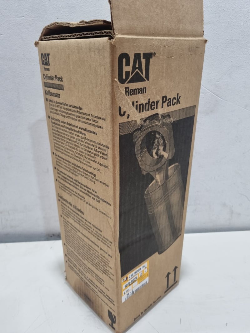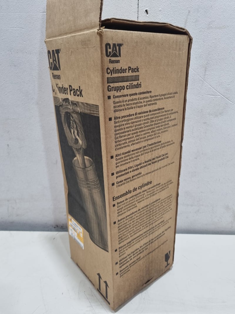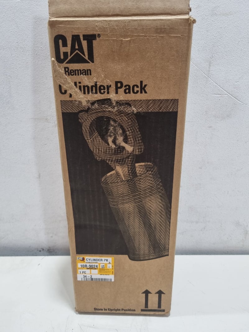 CAT Reman Cylinder Pack (Part No. 10R-9024). This is an original equipment manufacturer remanufactured cylinder pack assembly for Caterpillar machinery. The component features precision-engineered cylinders housed in protective cardboard packaging marked "Store in Upright Position." Multilingual instructions included (English, Italian, German). The pack contains a complete cylinder group suitable for CAT equipment maintenance and repair. Original factory packaging with yellow identification label intact.