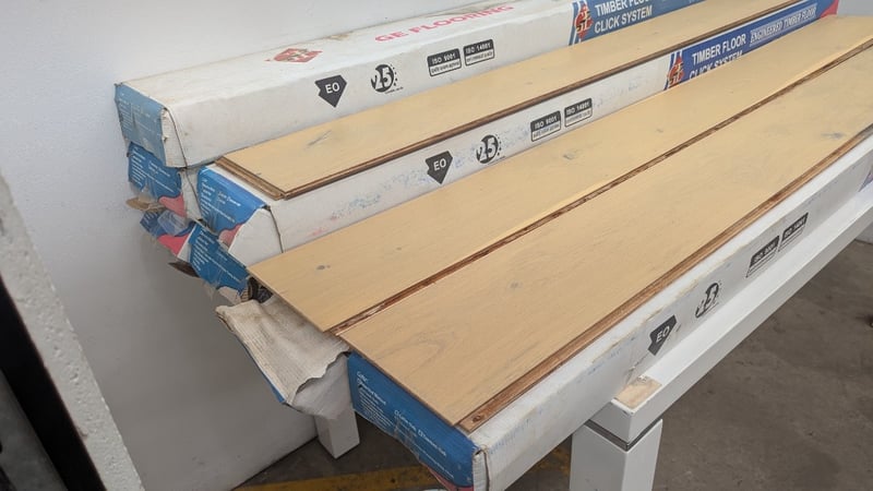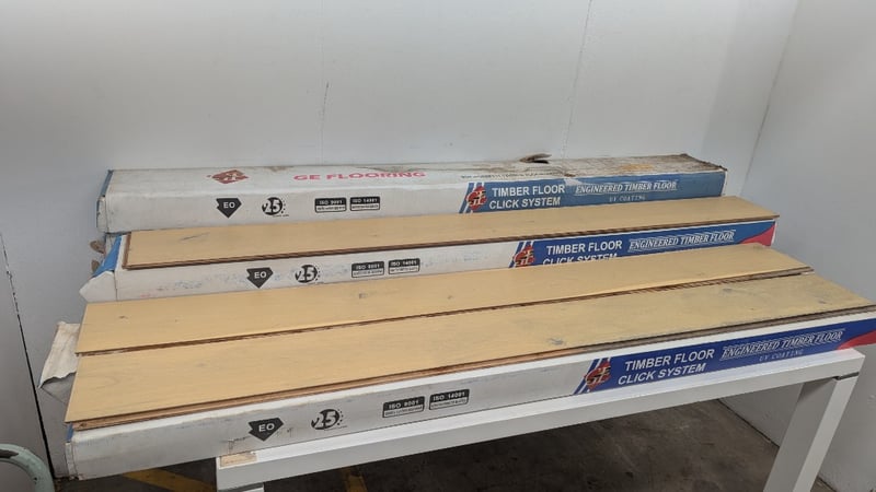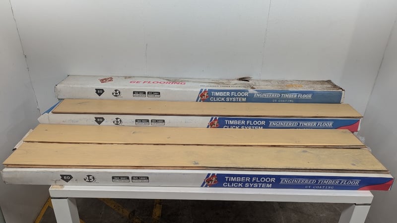 Timber Floor Click System, GE Flooring, Engineered Timber Floor, Colour Natural Oak, UV Coating, Dimensions 190cm×19cm×1.4cm, 6 Boards Per Box, 7 Boxes Plus Various Off Cuts, Quality Per LotSold As Lot
