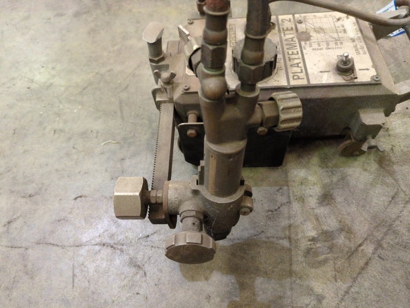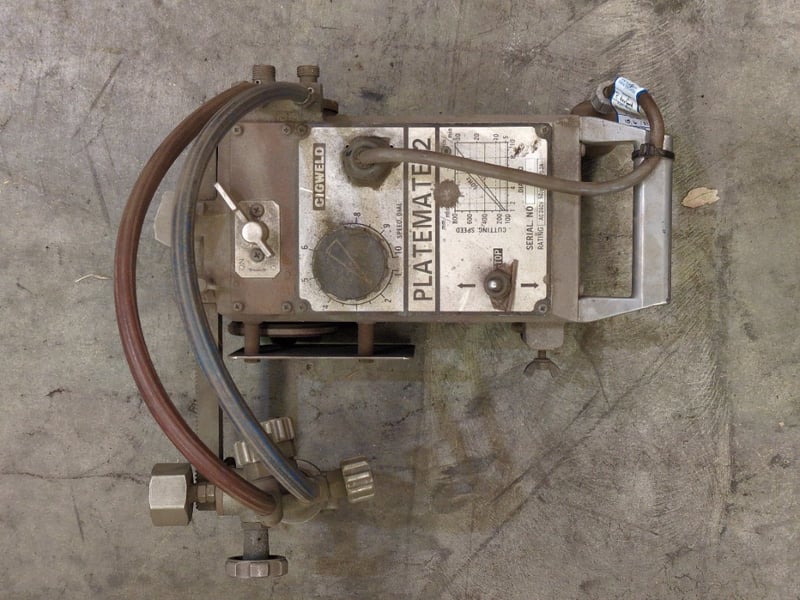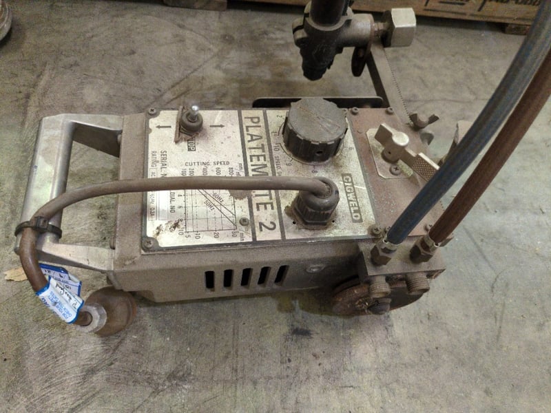 CIGWELD PLATEMATE 2 Portable Gas Cutting Machine Serial No: 341194 Rating: AC 240V, 50/60Hz, 0.2A Built for durability and precision, the CIGWELD Platemate 2 is a rugged, portable gas cutting carriage designed for automated straight-line and circle cutting. With adjustable speed control and dual gas lines, this unit is ideal for consistent, clean cuts in fabrication and workshop settings. Features: Heavy-duty metal frame with integrated handle for portability Variable cutting speed control (refer to dial and chart for 50Hz/60Hz compatibility) Torch mount with precision adjustment knobs Dual gas line inputs (oxygen and fuel gas) Suitable for both cutting and beveling applications Condition: Used, untested. Shows signs of wear consistent with workshop use including surface rust and grime. Inspection recommended prior to use. A reliable workhorse for any serious metalworking or welding operation.