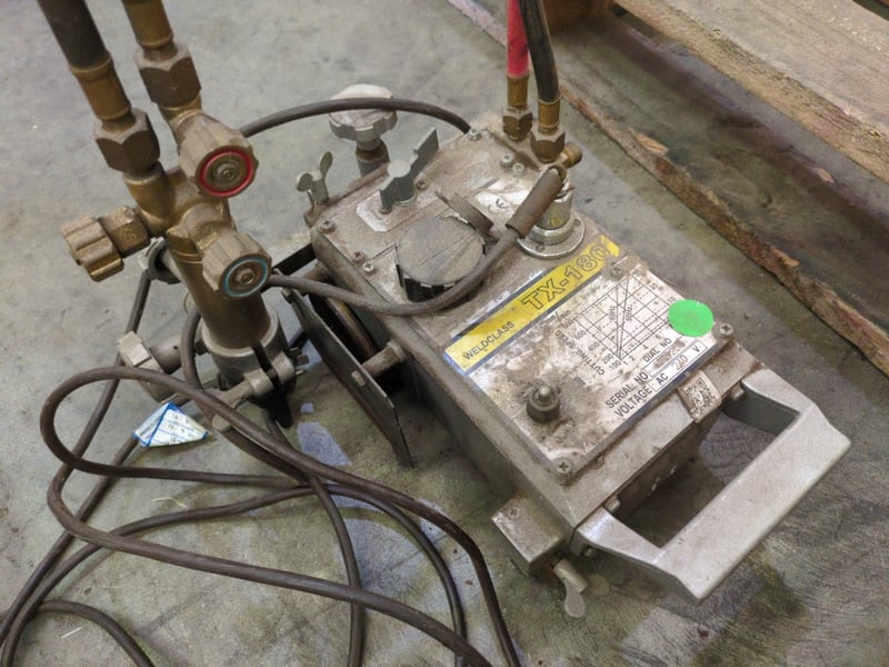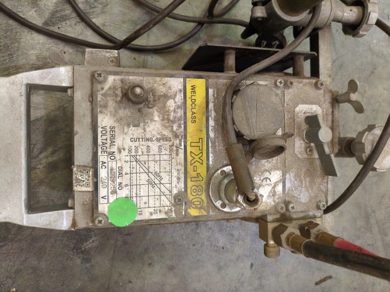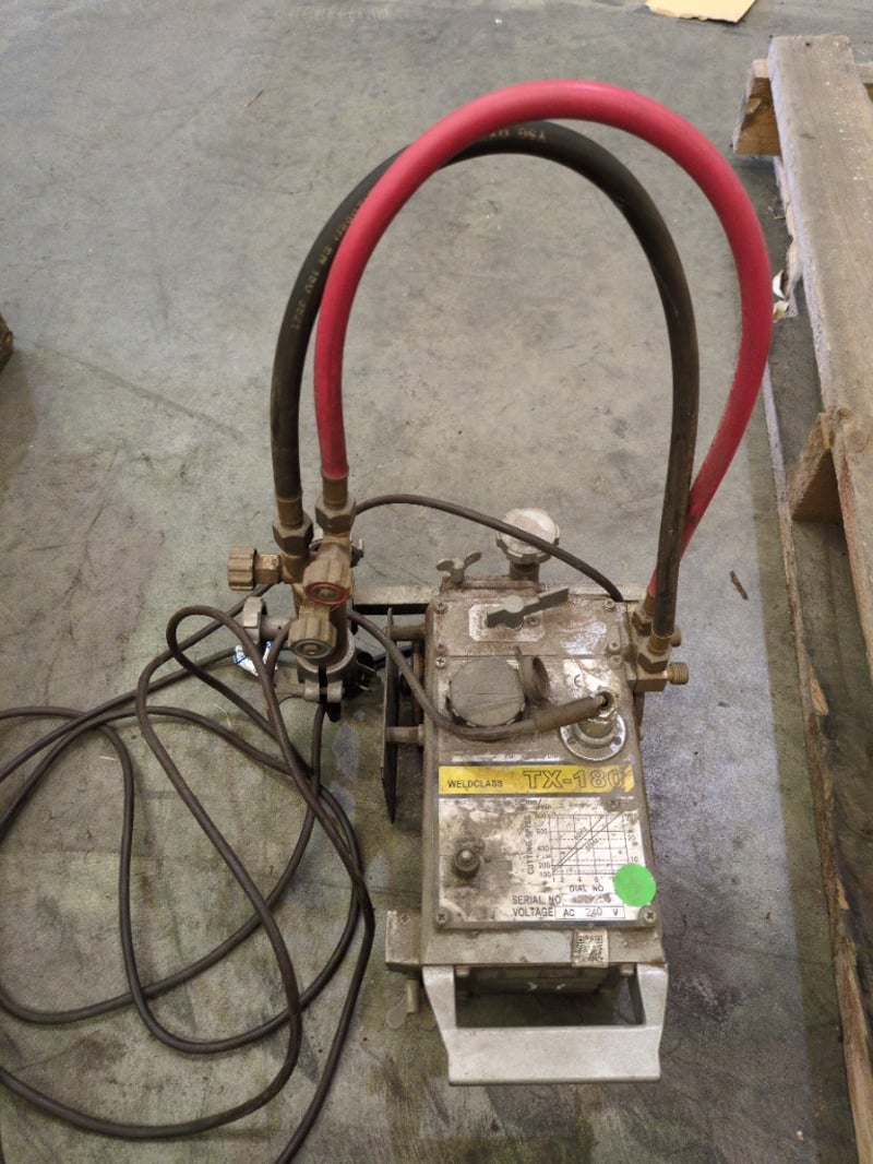 WELDCLASS TX-180 Portable Gas Cutting Machine Serial No: 219256 Voltage: AC 240V The Weldclass TX-180 is a compact and reliable gas cutting carriage ideal for precision straight-line or profile cutting. Built for portability and robust performance, this model is designed to handle demanding fabrication and metalworking environments with ease. Features: AC 240V operation, suited for workshop power supply Adjustable cutting speed (mm/min) with visual reference chart for 50Hz and 60Hz settings Dual gas hose connections for oxy-fuel cutting Durable body with integrated handle for easy transport Manual and dial adjustments for precise operation Condition: Used, untested. Displays general wear, dirt and surface oxidation from workshop use. Sold as-is — inspection recommended. A practical addition for any fabrication team looking to boost cutting efficiency and consistency.