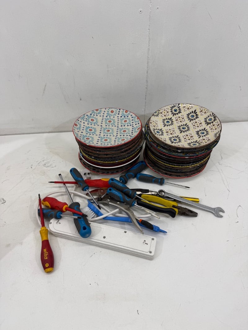 Plates & Hand Tools, Assorted Plates from Pots Patten, Assorted Hand Tools from Workzone. sold as lot