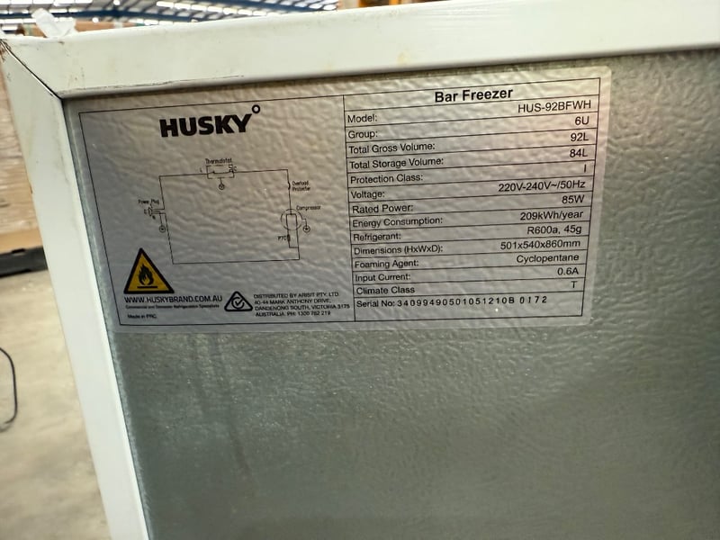Fridge, Husky Bar Fridge, Model- HUS-92BFWH, Serial number- 34099490501051210B0172.