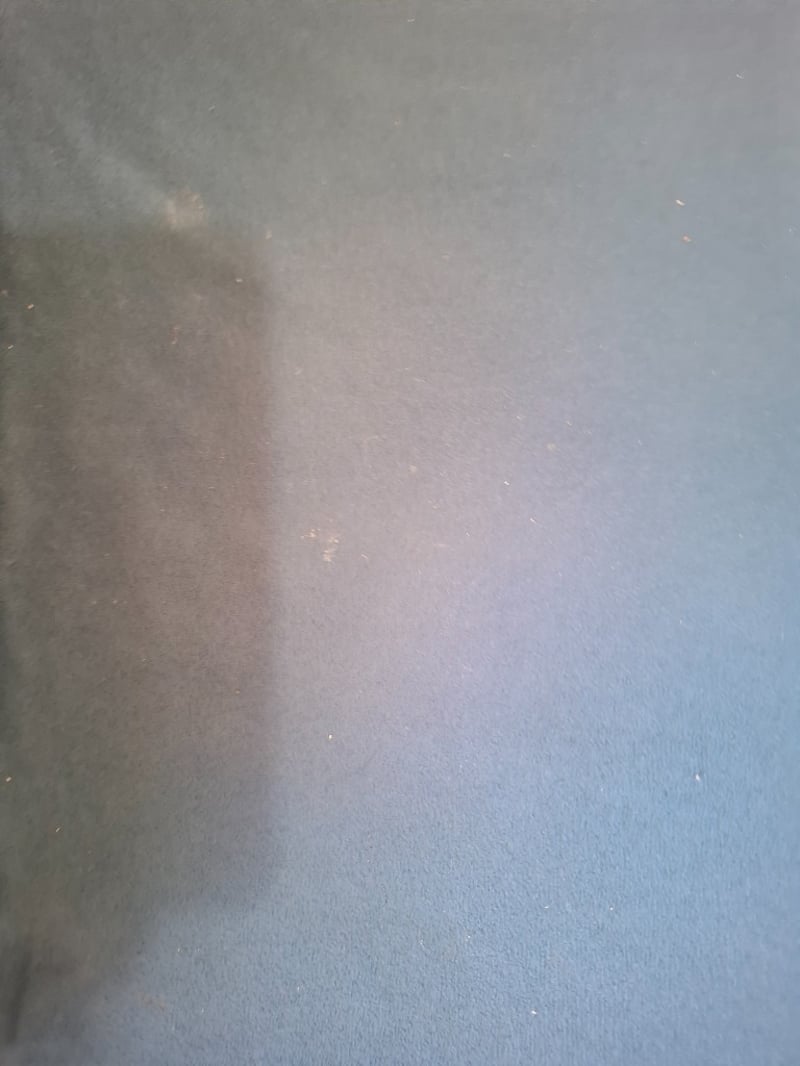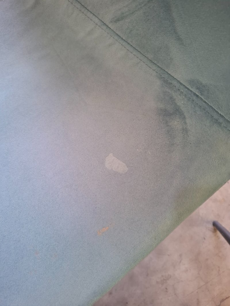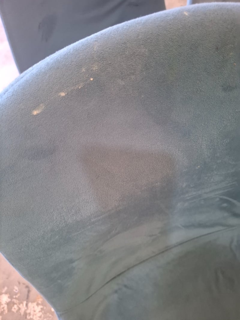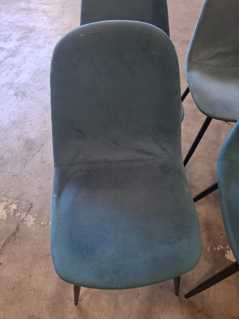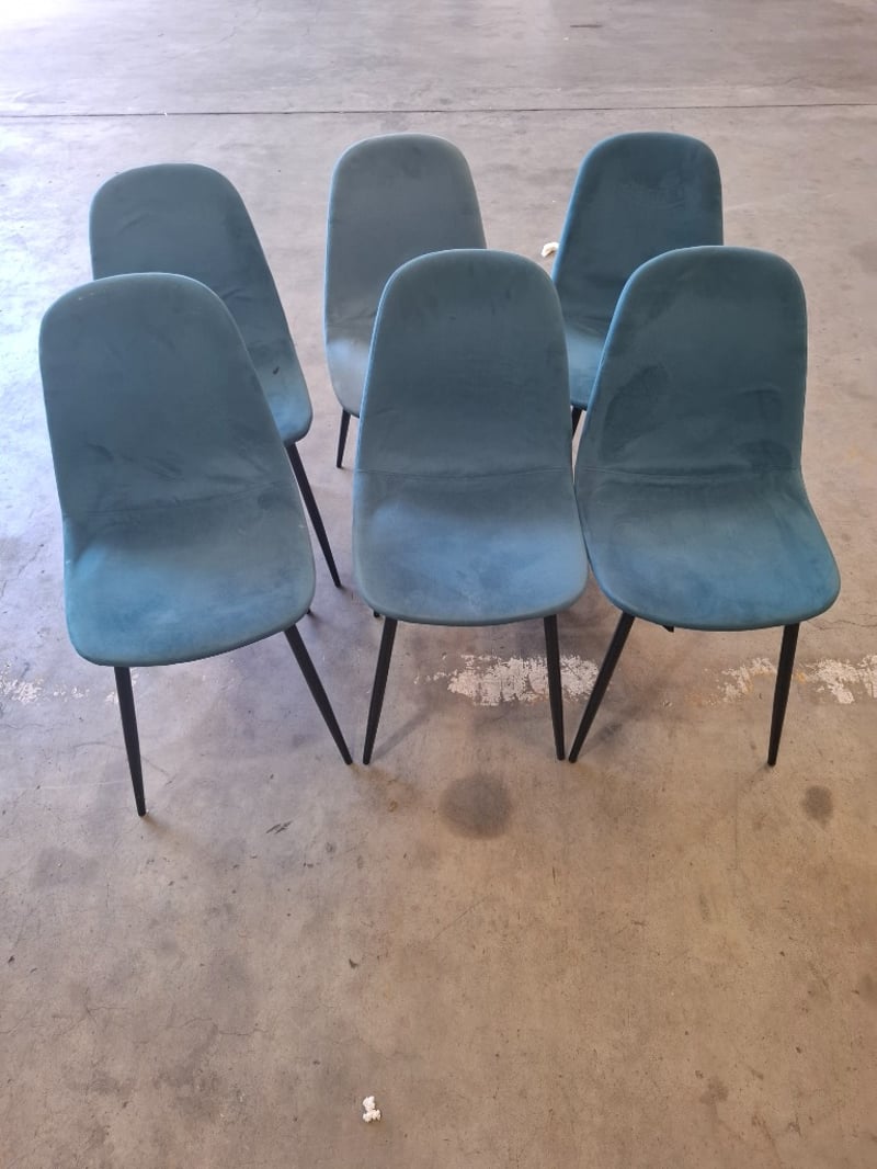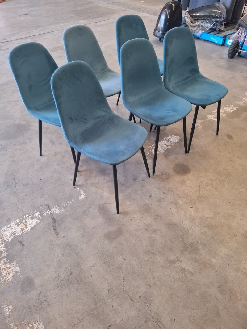 6 x Blue cafè style chairs, some wear and tear marks and scuffs on fabric and metal legs.
