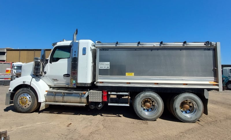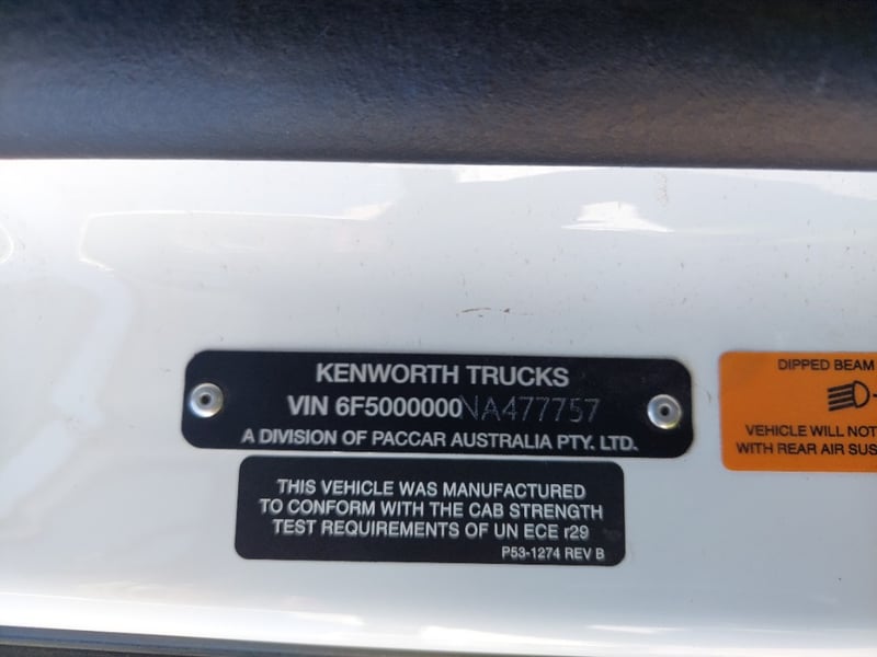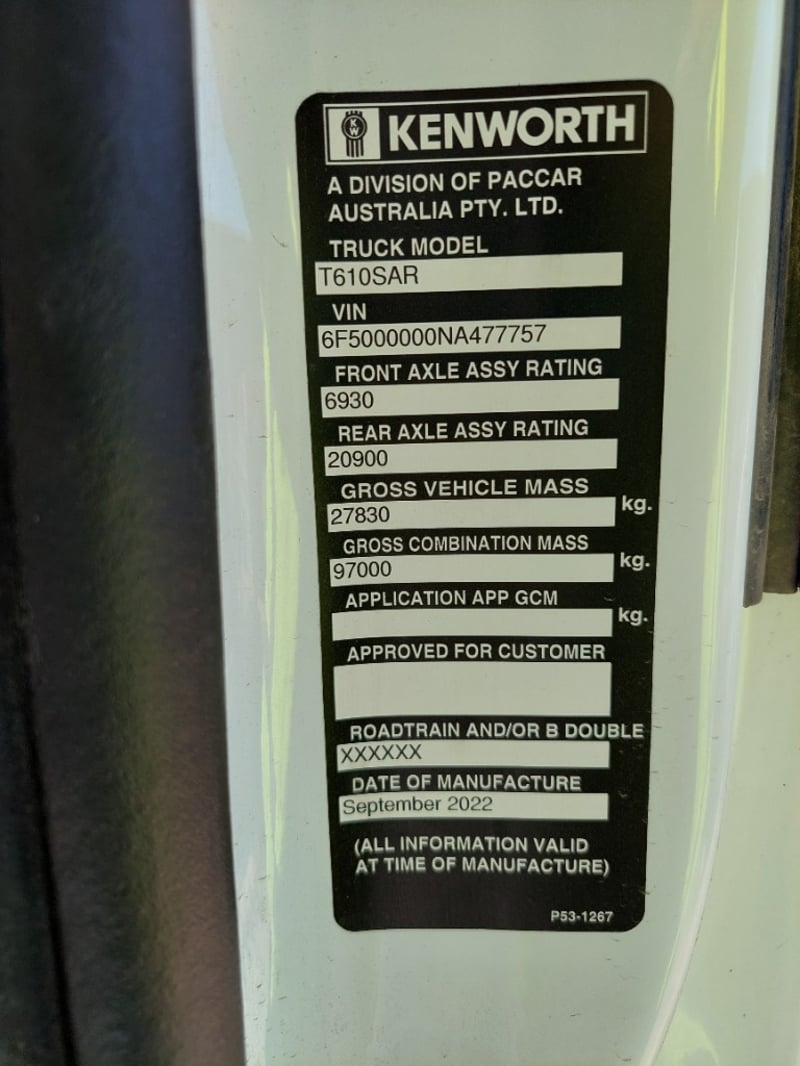 2022 Kenworth T610SAR Tipper Year: 2022 Make: Kenworth Model: T610 SAR Tipper Body: 2-Door Tipper Truck Drive Type: Rear wheel drive Odometer: Indicating 104,555 Kilometers Engine: Cummins X15 Transmission: Automatic Colour: White Seats: 2 Body: Tipper Tray / body size: 4400mm L, 2700mm H (top of tipper to bottom), 2400mm W Configuration: 6x4 GVM: 27830KG GCM: 97000KG Key: 20CA VIN: 6F5000000NA477757 ENG No: 80436483 (AS PER PPSR) (Key #20CA Marple) Lloyds stock #581006+1