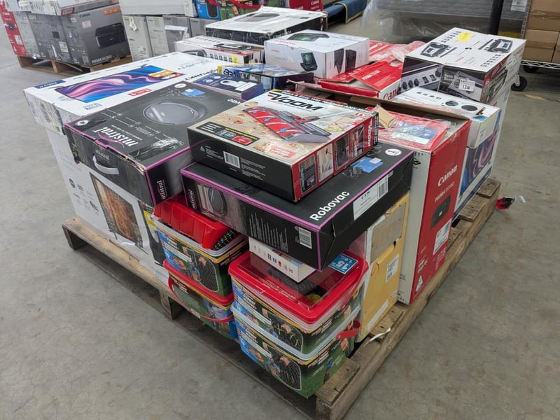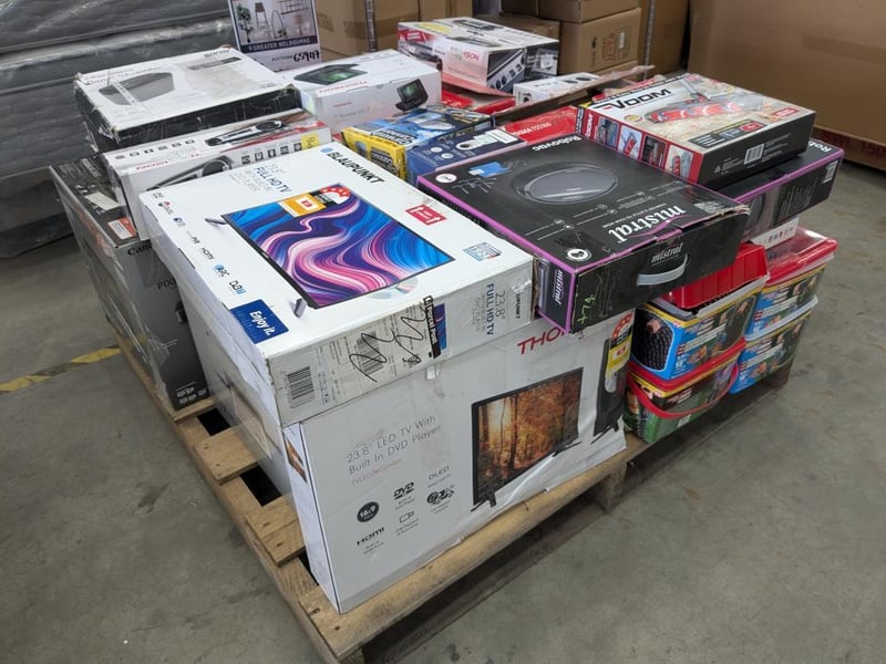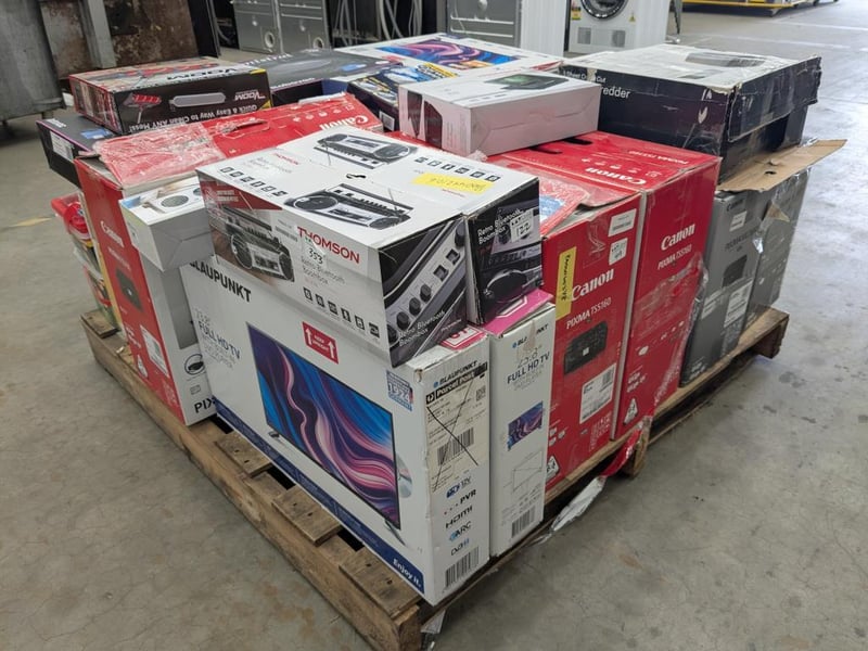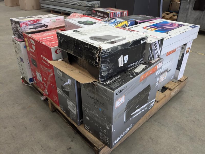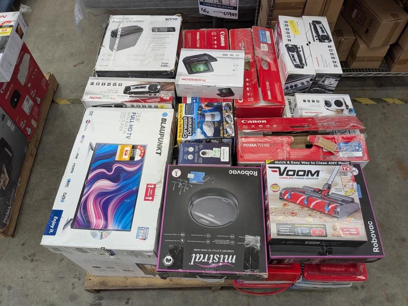 Assorted Bundle of Tech, Appliances and Homewares Includes: Blaupunkt 23.8" TV's Mistral Robovacs Voom power sweepers Canon TS5160 printers Thomson bluetooth boomboxes Carwash Cannon Thomson 23.8" LED TV Copper Bullet Hose Security Camera Soniq Paper shredder Thomson DVD player