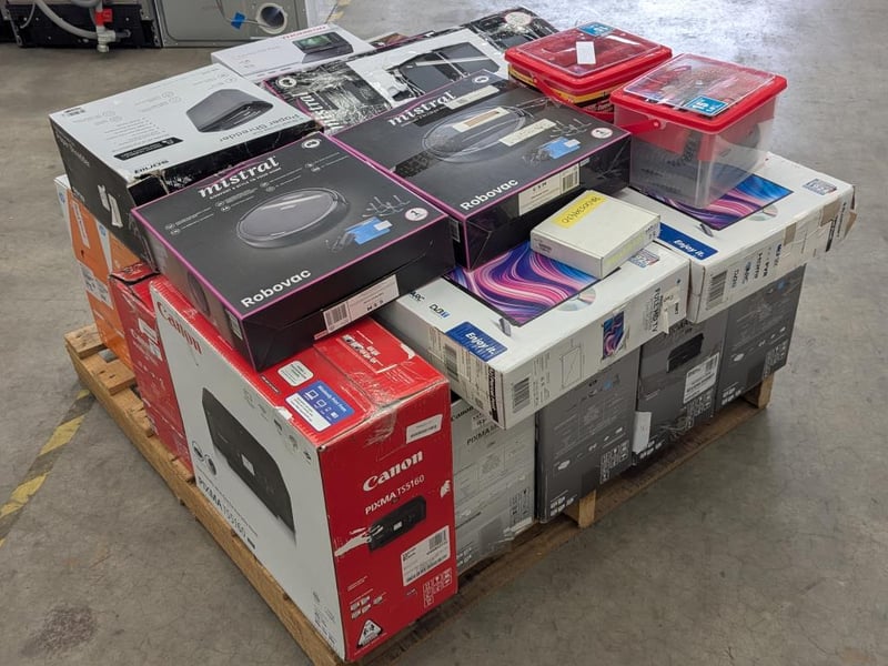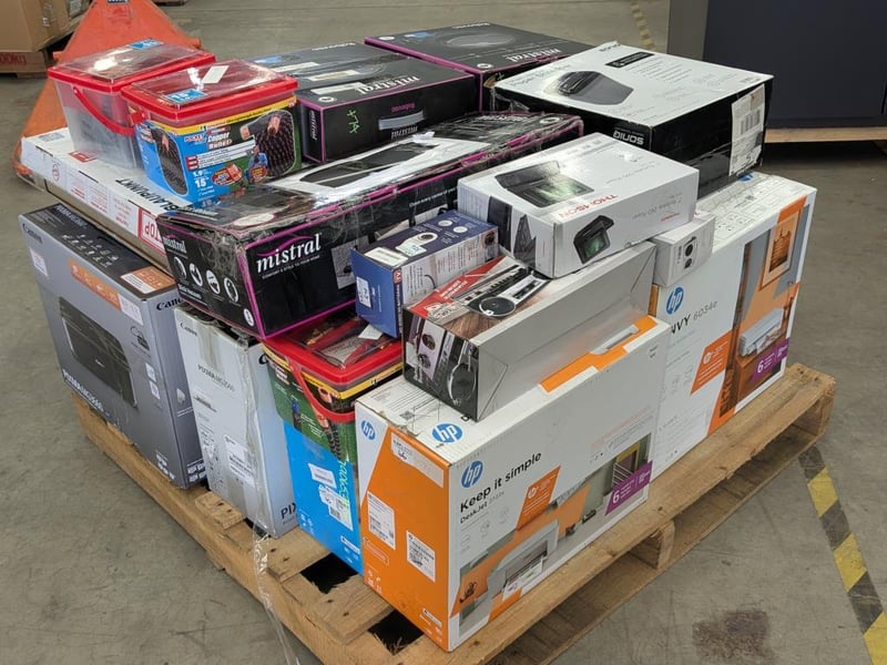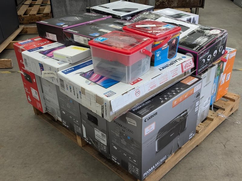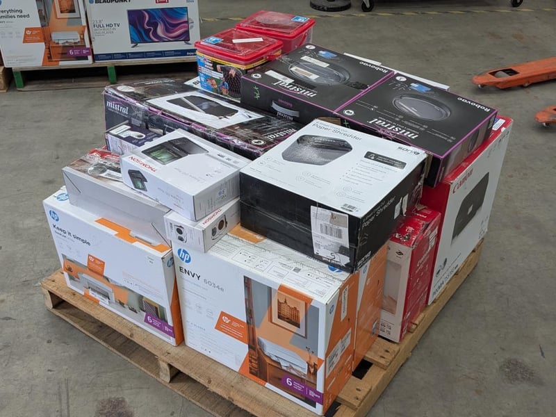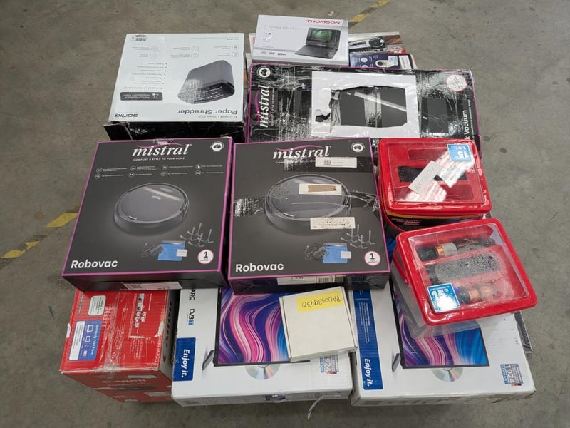 Assorted Bundle of Tech, Appliances and Homewares Includes: Blaupunkt 23.8" TV's Mistral Robovacs Thoompson Bluetooth Boombox Soniq Shredder Canon TS5160 printer Copper Bullet Hose Thomson DVD player Canon Pixma Printers