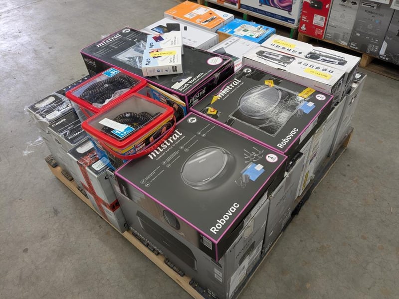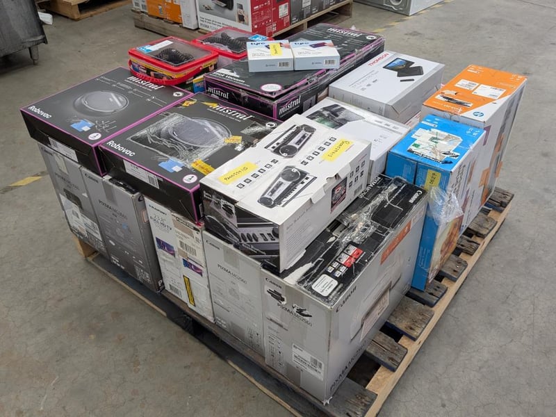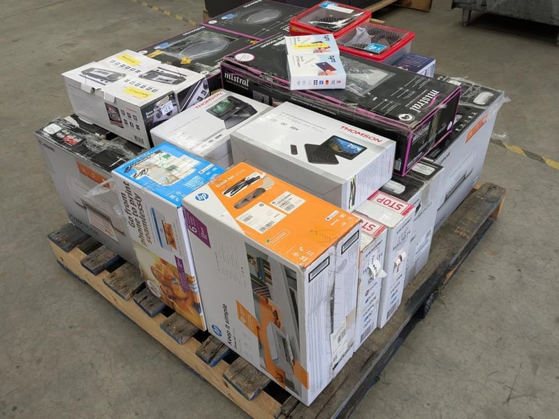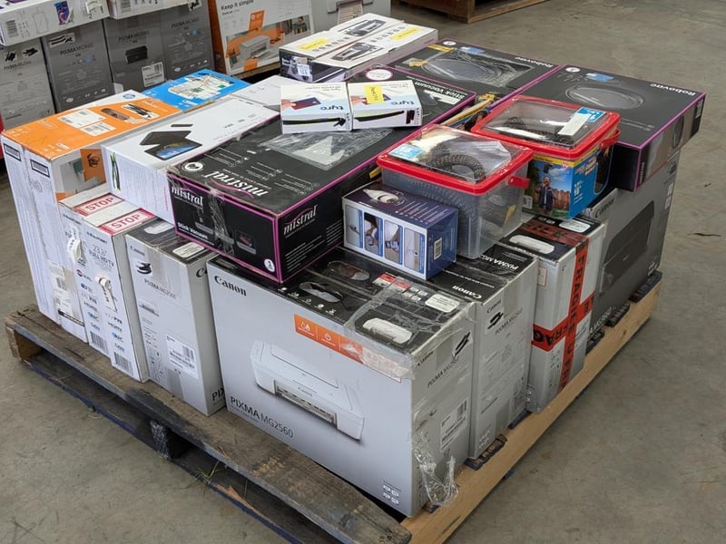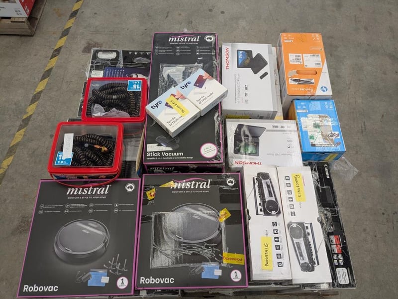 Assorted Bundle of Tech, Appliances and Homewares Includes: Blaupunkt 23.8" TV's Mistral Robovacs and Vacuum Thoompson Bluetooth Boombox HP Printer Copper Bullet Hose Thomson DVD player Canon Pixma Printers