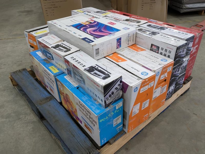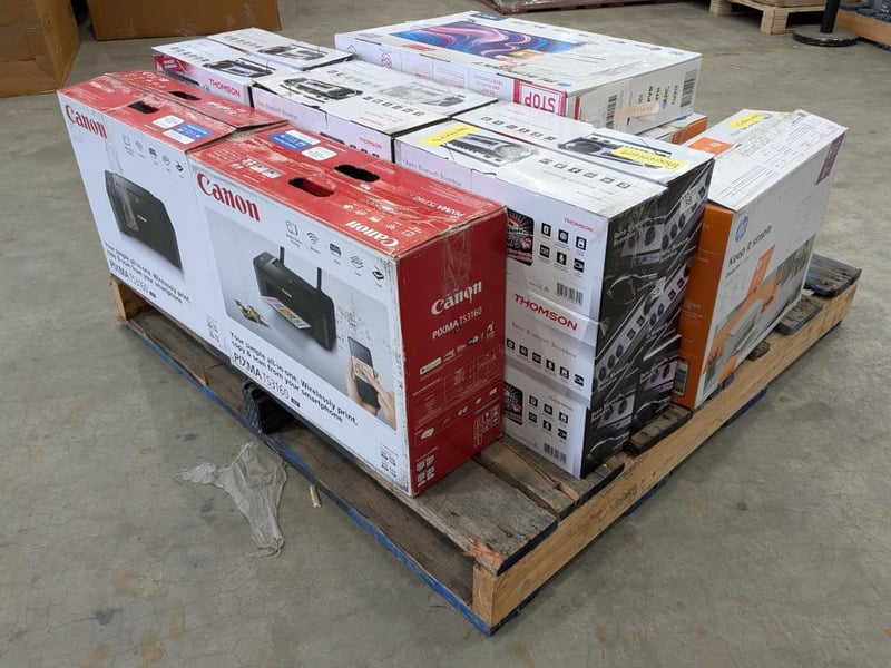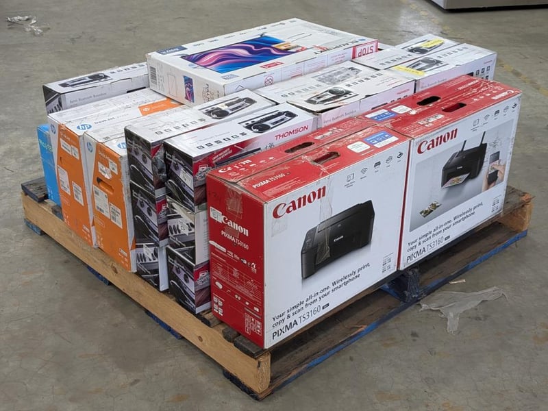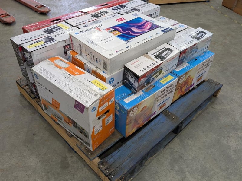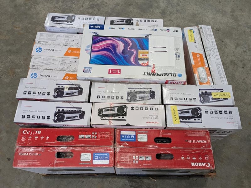 Assorted Bundle of Tech, Homewares and Electronics Includes: HP Printers Blaupunkt TV's Thomson bluetooth boomboxes