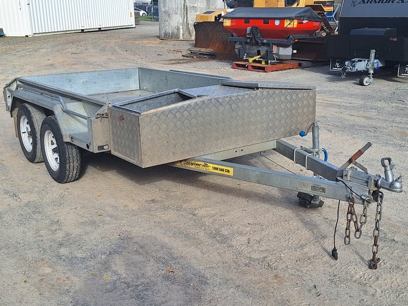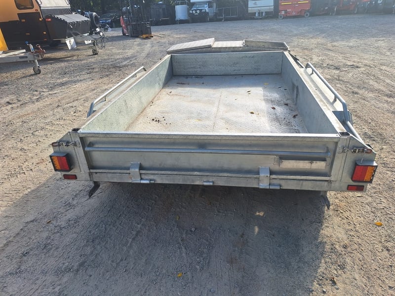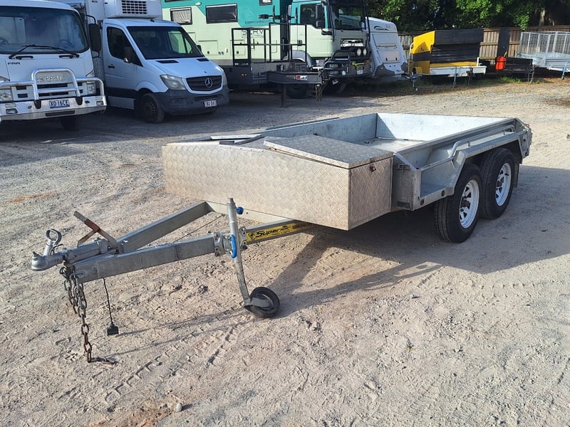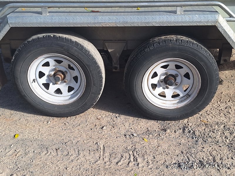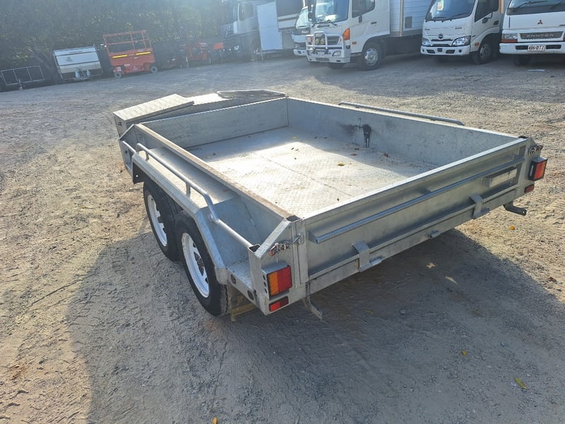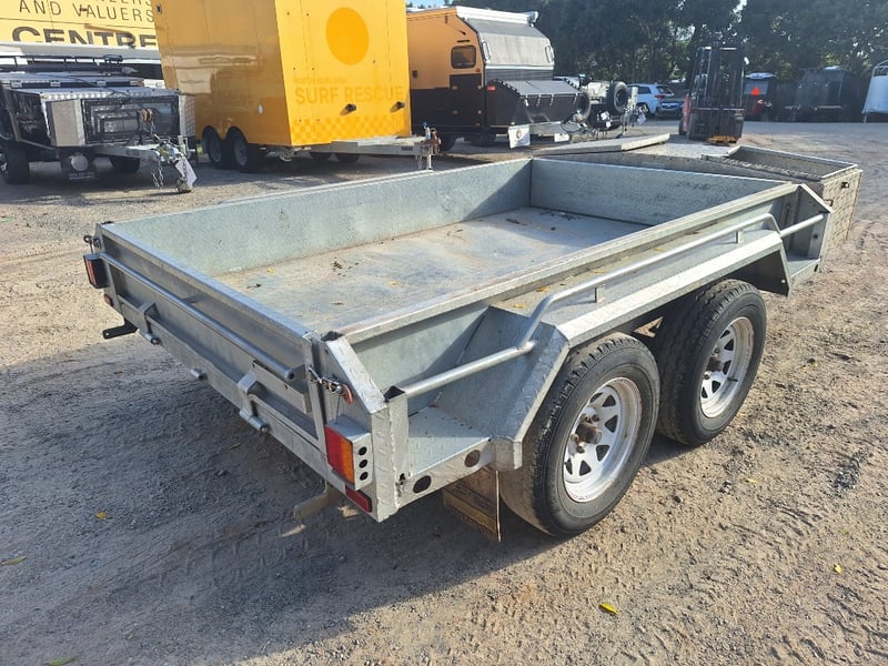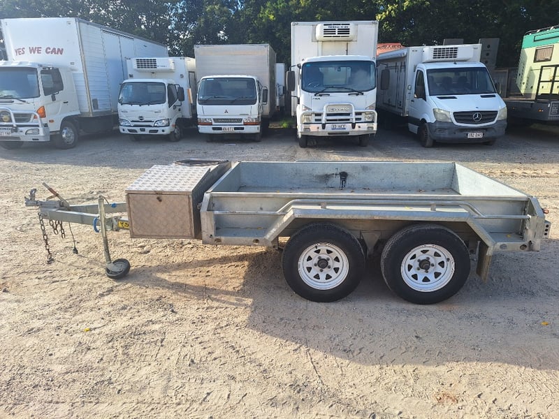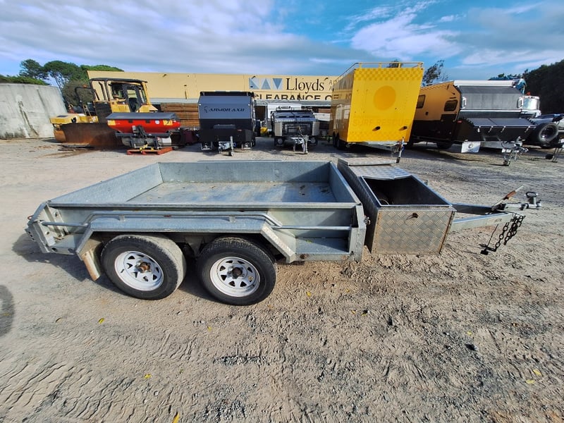 Description/Extras: 8x5 Dual Axle Box Trailer, 50mm Hitch Broken Jockey Wheel, Handbrake, 7-Pin Flat Male Connection, Front Mounted Checkerplate Box 1 x Lid Missing, Other Needs Repair