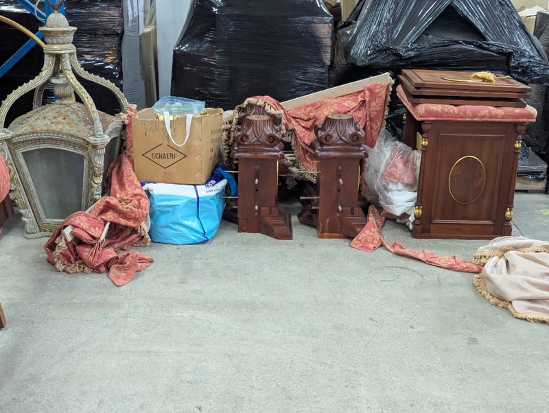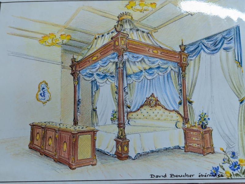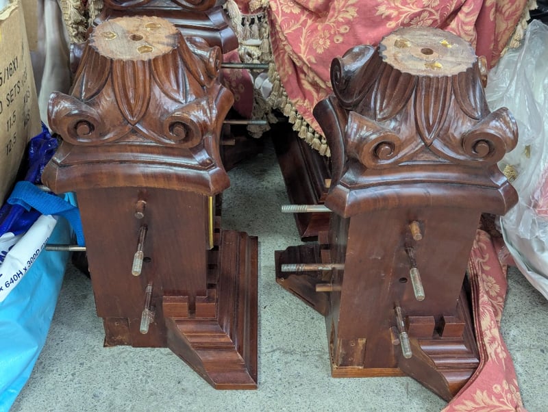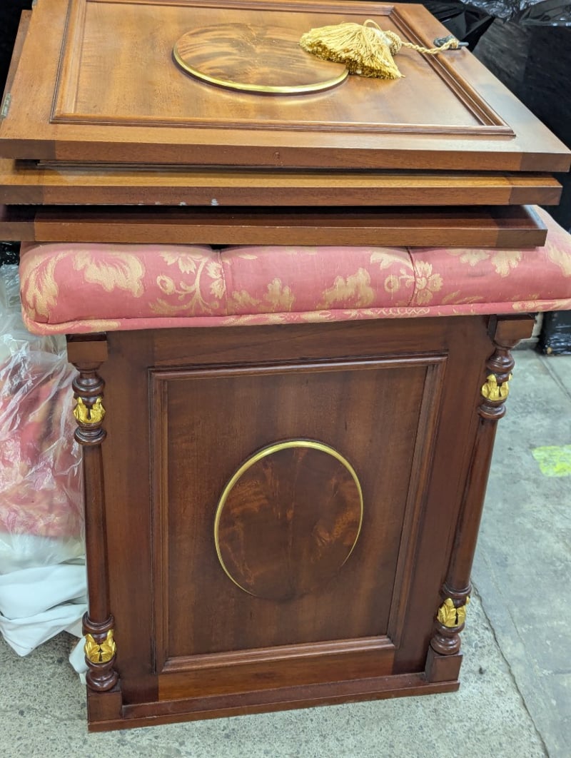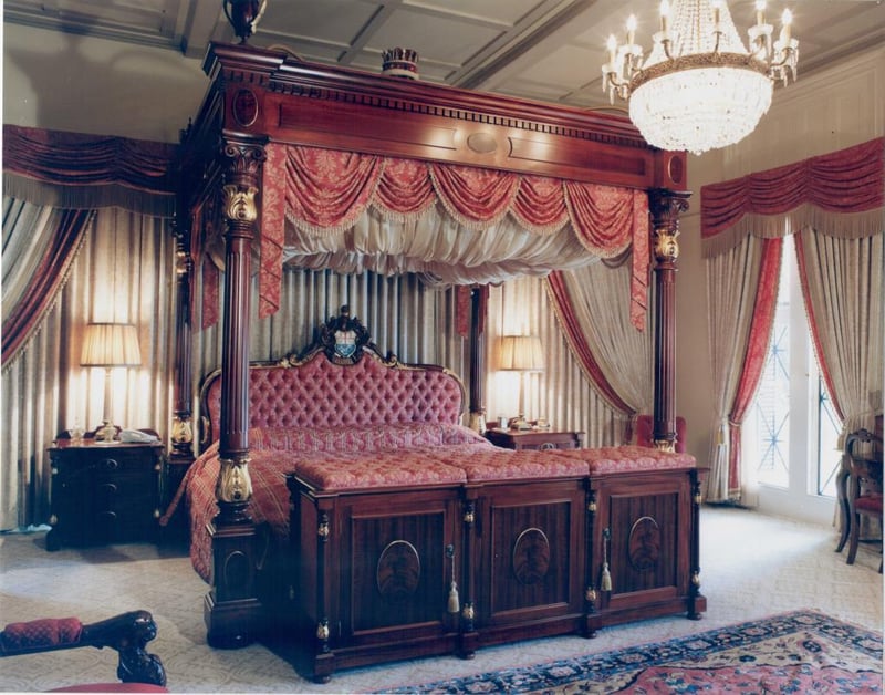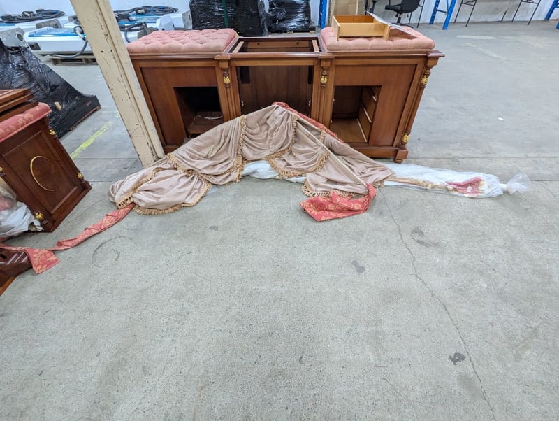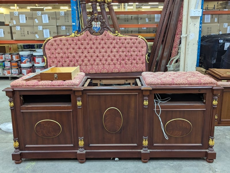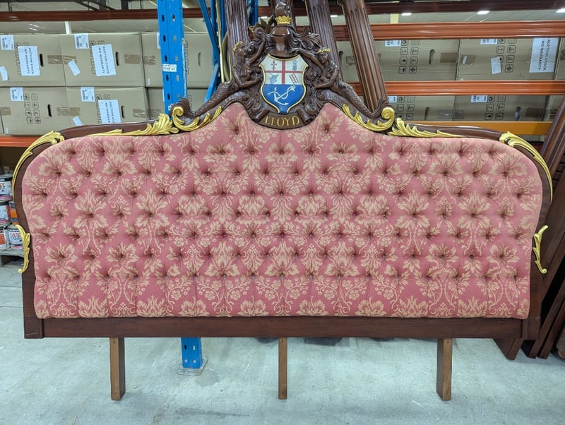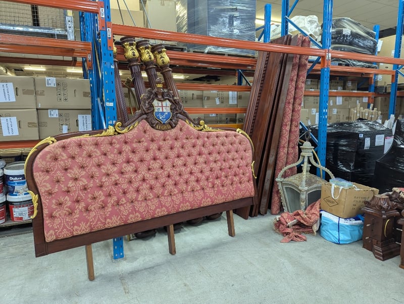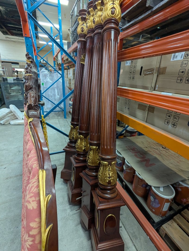Four Poster Bed, timber frame and posts, ornate decorations, bed end buffet, red finish patterned cushioningSize: King, Dimensions: unknownNote: unassembled, unknown if all hardware is includedPLEASE NOTE : Due to the nature of this item, shipping is not available. Local collection only.