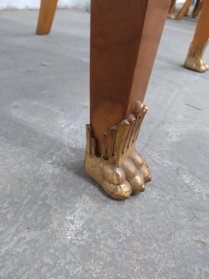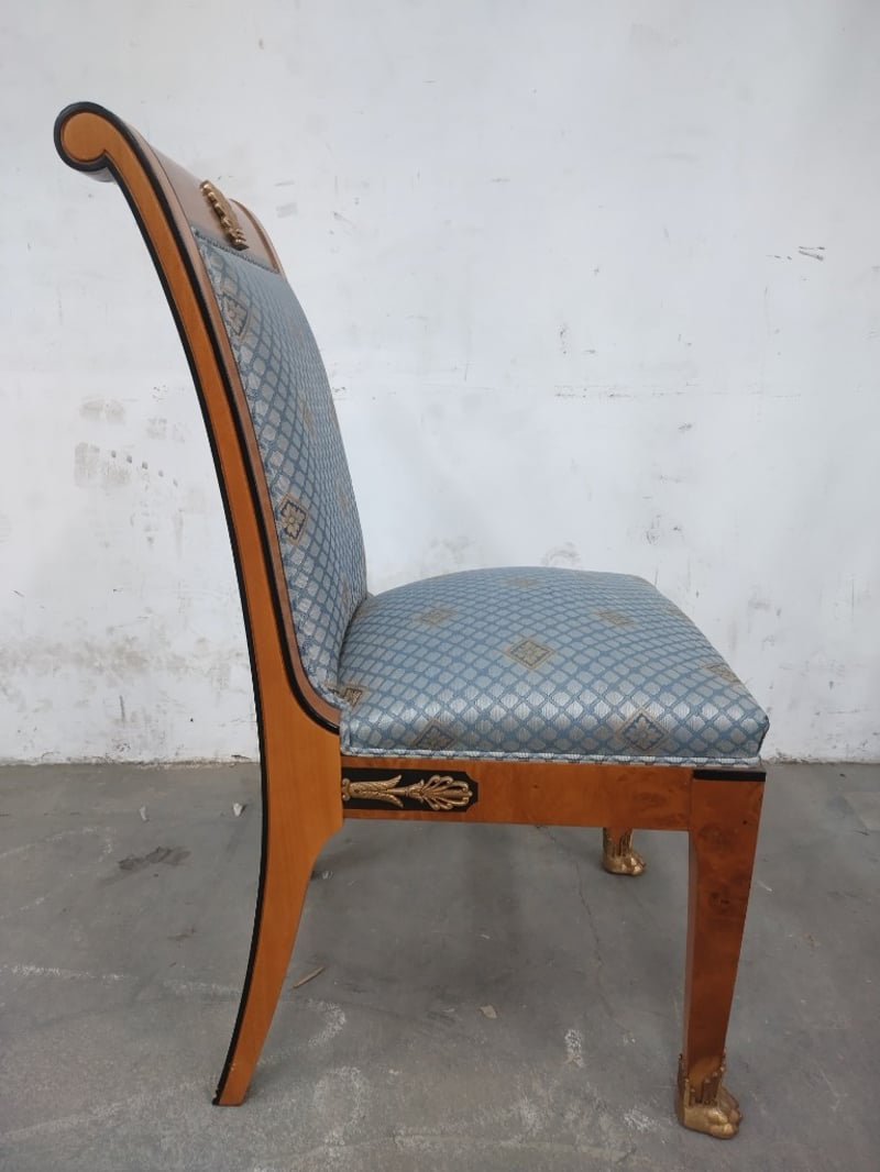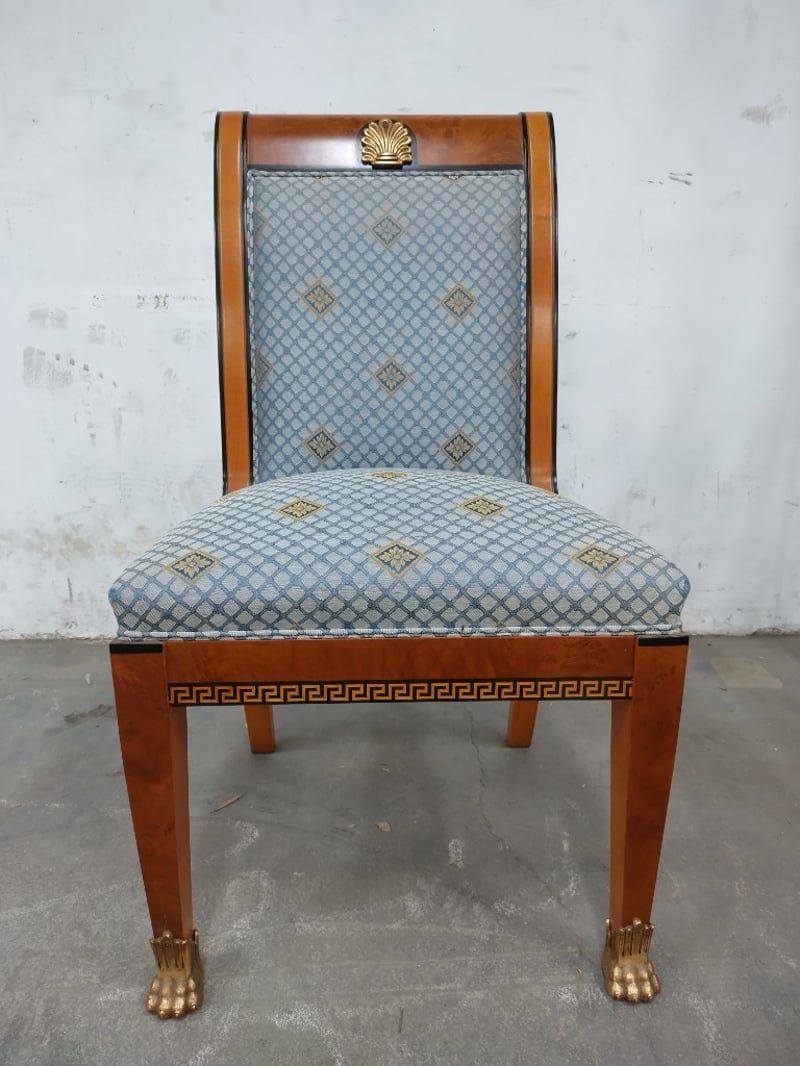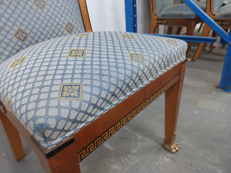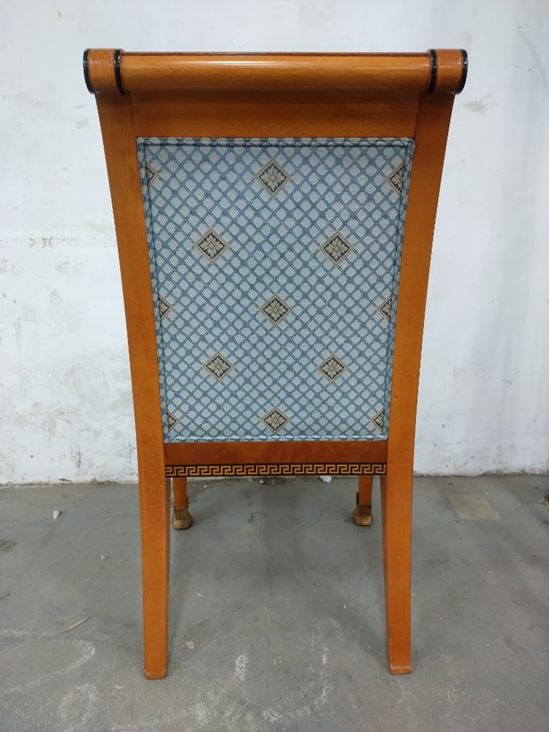 Solid Timber dining chairs with blue patterned finish seatingDimensions: H 95cm x W 51cm x D 60cmBID PER EACH, MUST TAKE 6